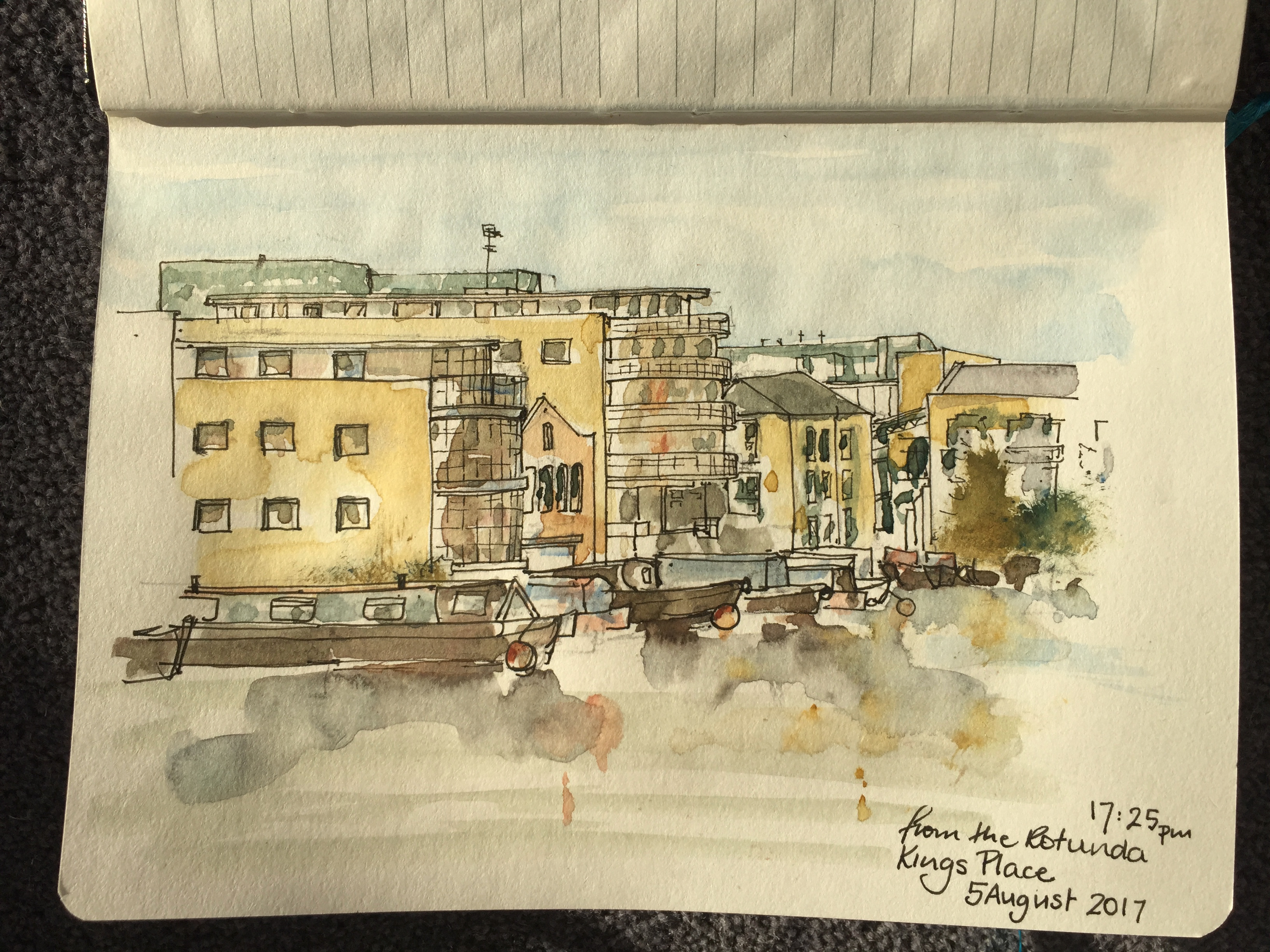 I drew this from the Rotunda restaurant in Kings Place, looking across Battlebridge Basin. The low building in the middle with the pointed roof is the London Canal Museum.