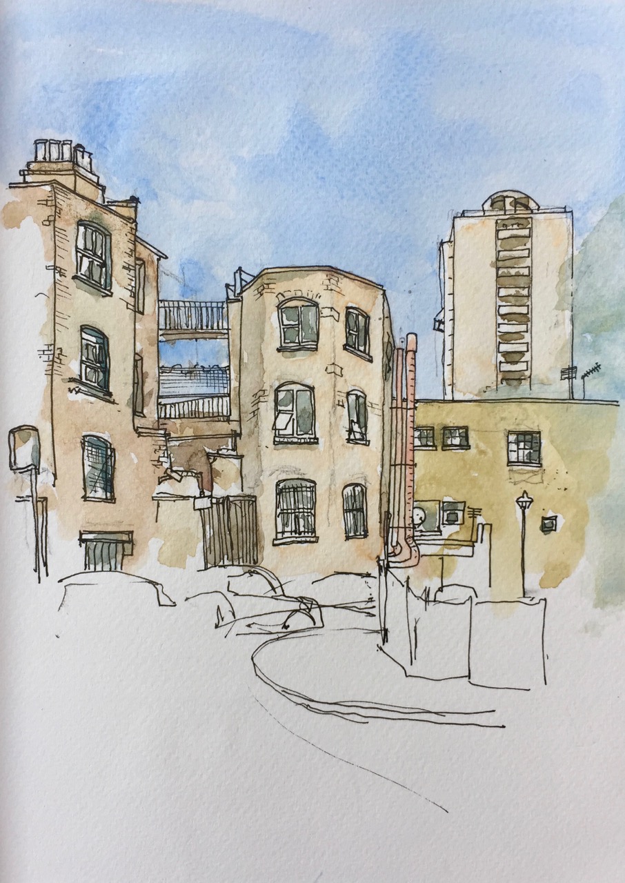 Turnpike House is part of the “Kings Square Estate” managed by Islington. It has 20 floors and was built in the 1960s as council housing. There is a current renovation programme, which is why there is scaffolding down the left hand edge of the tower in the drawing.