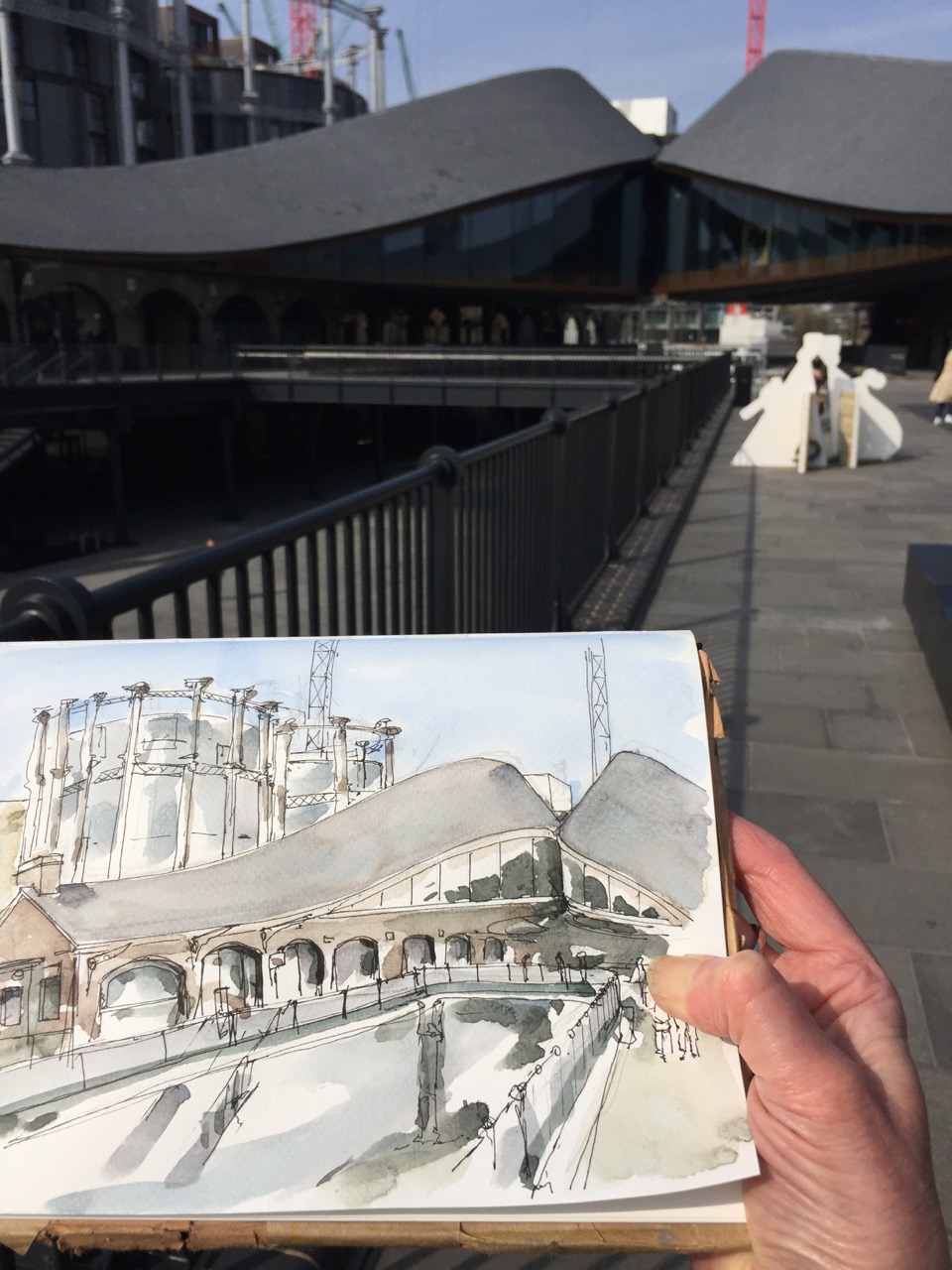 Graham St is the extension of Central St northwards, and I was on my way north to Kings Cross to meet someone at the Skip Garden. But the Skip Garden was closed on Mondays, and my friend was waiting outside. We adjourned to the marvellous new development “Coal Drops Yard”. This is a 21st century adaptation of old coal sheds. The old sheds are turned into two levels of shops and restaurants, but in the modern way, old brickwork and chunks of Victorian cast iron are retained. Most spectacular is the roof.