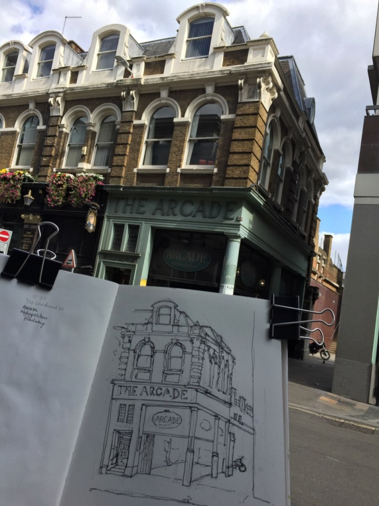 This is an astonishing construction, left over from an earlier epoch, and now surrounded by new-build and glass and steel office buildings. It is a corridor of shops, like the famous passages in Paris. But actually, not like them. Since it was Sunday, the Arcade was not trading. It was looking rather dilapidated. As I sketched, I saw tourists make their way in there uncertainly, in a characteristic pose of staring at the mobile phone and glancing about. Evidently Google was telling them that Liverpool Street Station could be accessed was down there. It cannot, not on a Sunday. As they entered the Arcade, they looked about. Then they really looked about, rather than comparing the world to the mobile phone map. They suddenly saw the broken glass, dusty shop fronts and cardboard, and the feet and legs of someone lying on the ground. They abruptly turned around and came out again into the sunlight, staring accusingly at the phone.
