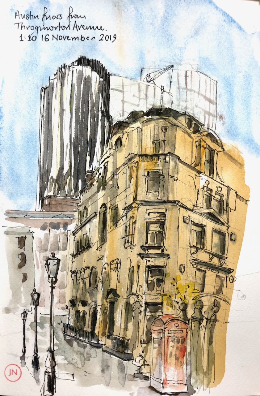 The City is quiet on a Saturday. Here is a view along one of the City lanes, Austin Friars. I drew it from the back (east side) of Drapers Gardens, which is a new office block on Copthall Avenue.