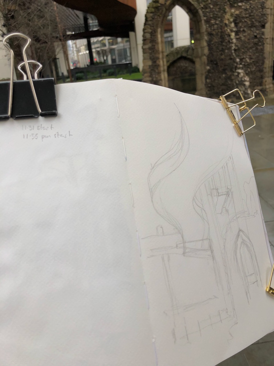Here’s another drawing on London Wall place. This is a view of the highwalk from underneath. I was standing by the new café, Barbie Green, sheltering from the rain.