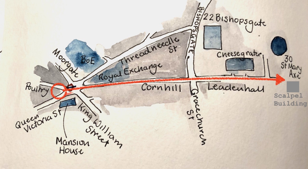 Visitors’ guide, conveniently placed at Bank, but showing none of the very conspicuous recent buildings. It’s hard to keep pictures up to date in the City, especially if the picture is made of steel.