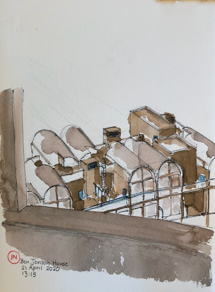 Sketching from the window, here is Ben Jonson, part of the Barbican estate.