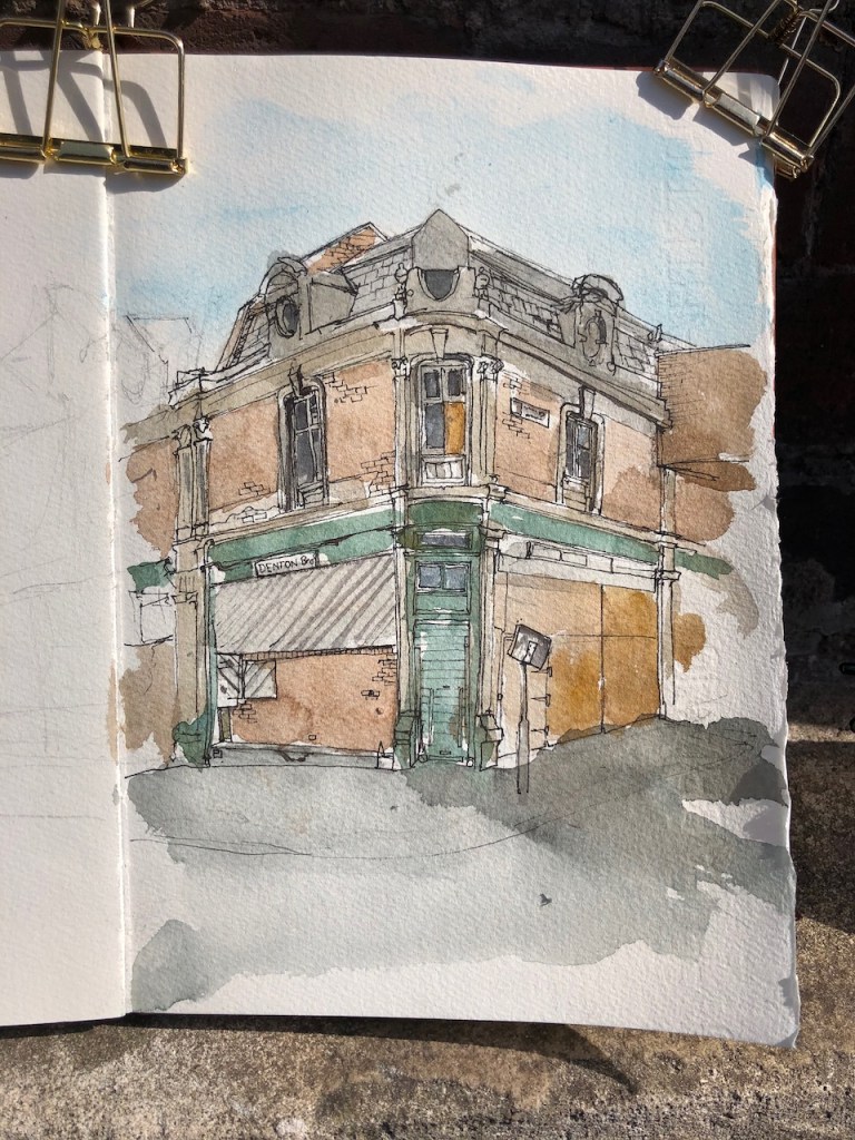 I had better do some more sketching around Smithfield, before the whole thing is swathed in plastic and transformed. Here is work in progress on the sketch. It took one and a half hours. The colours are: Phthalo Turquoise, Mars Yellow, Perylene Maroon and a bit of Transparent Pyrrol Orange.