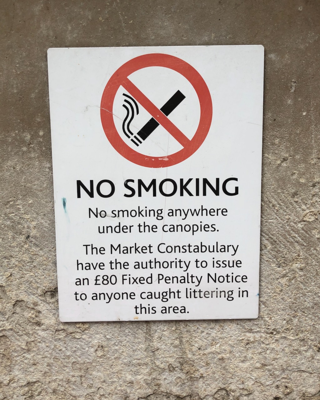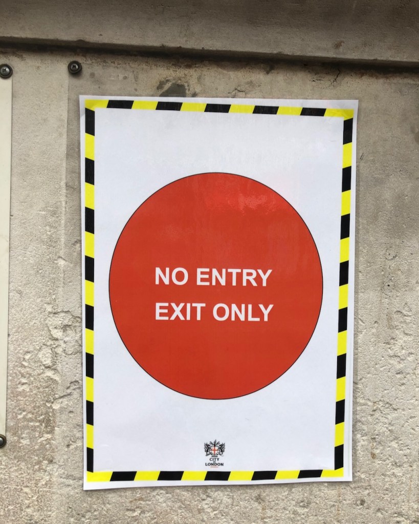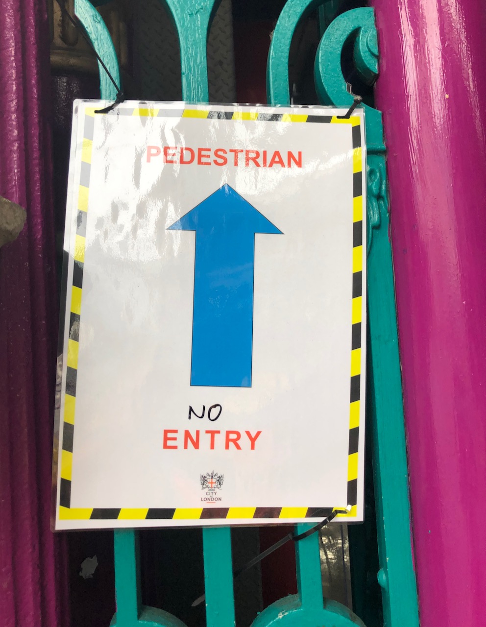 Here on this notice board is a whole timeline of concerns and instructions, layered. At the back we are alerted to the potential danger of terrorists. In the top left hand corner the Food and Hygiene Act is invoked on fading yellow paper. This is partially obscured by simpler and recent instructions to stay 2m apart. And the future appears too: the notice on top is about the proposed redevelopment.