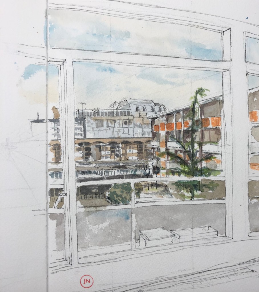 In the centre of this drawing is one of the features I particularly admire in the Golden Lane Estate. There is an “outdoors room” at Podium Level integrated into the Leisure Centre. The space feels like a room: it is roughly square and has a roof. On one side are glass windows which overlook the swimming pool, and on the other side the windows look down into the indoors exercise space. I feel sure that the architects in the 1970s anticipated that this outdoors space would be used for Yoga, or Martial Arts, or perhaps storytelling. They might have envisaged yoga mats, bean bags. It seems to me to be so clearly part of the Leisure Centre, that it must have been intended for a group exercise of some sort. It is now well maintained, but not used (as far as I can tell), except as a transit route. I drew a picture from there.