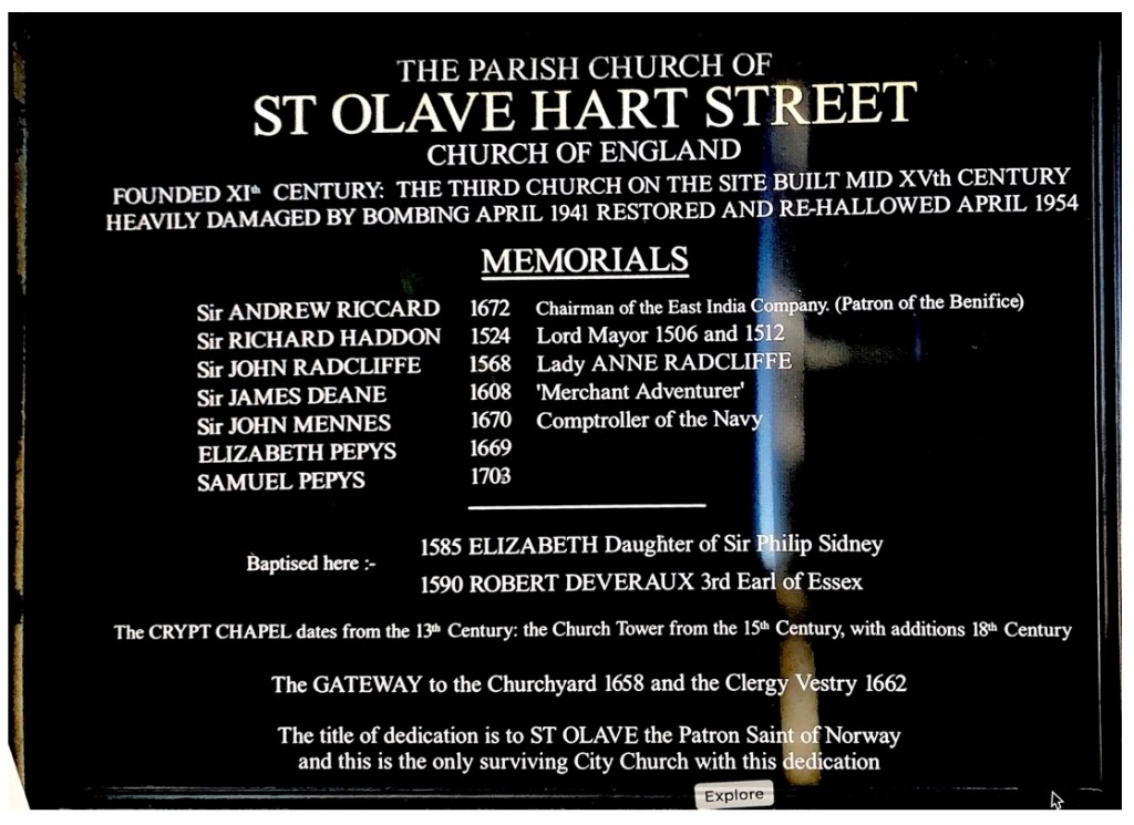 The spire with the weathervane is St Olave Hart Street, which was Pepys’ church. It is just visible in between the more modern buildings.