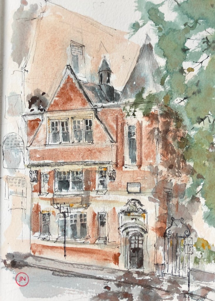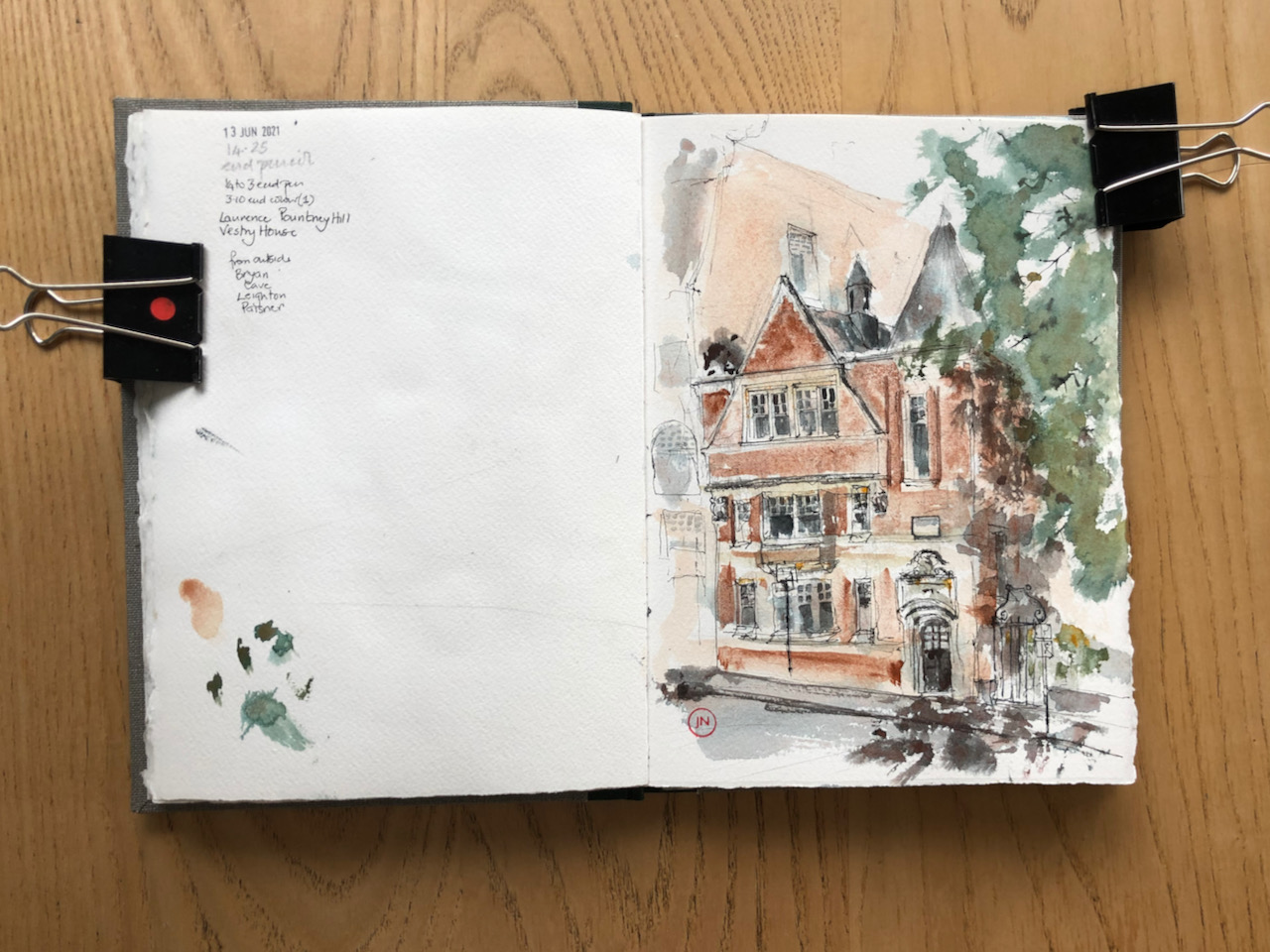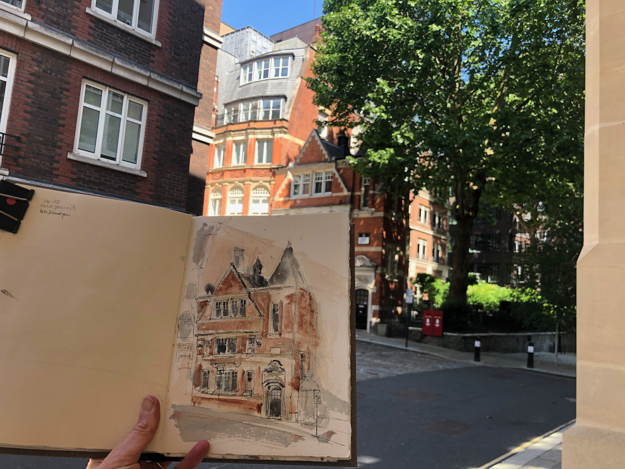 I sketched from a raised walkway on a modern office block opposite. Here are some work-in-progress photos.