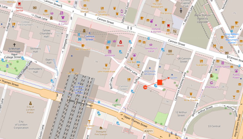 Here is a map showing the location of Laurence Pountney Hill. The red square is Vestry House, the arrow shows the sightline of the drawing.