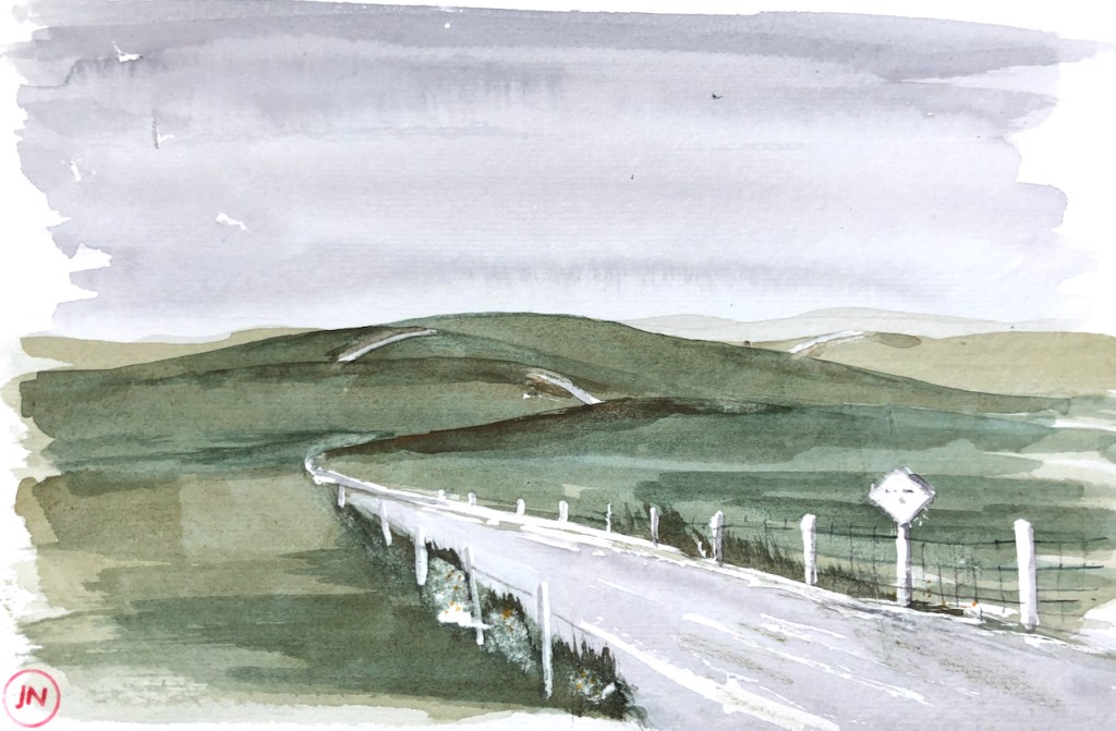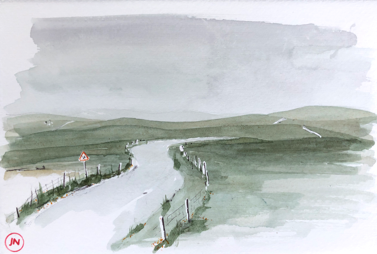 Shetland roads sweep across the landscape. I enjoy the calligraphic sweep of their curves and the simplicity of the lines they make.