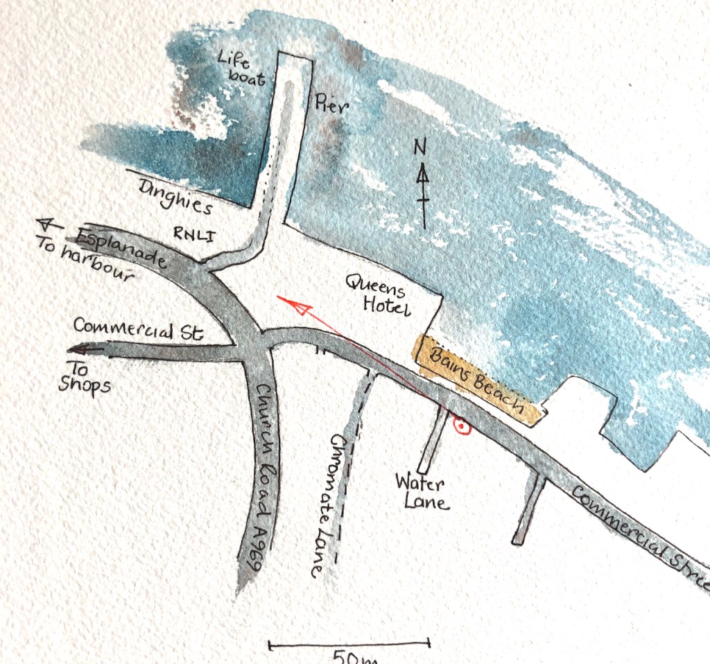 I drew this picture sitting on a bench next to the aptly named “Water Lane”. I was just thinking how peaceful it was, how few people, and how unlike London, when a car came and parked directly in my line of sight, blocking my view of the part I had yet to draw. A small family emerged out of the car. Children ran around with buckets and spades, a woman corralled them down the steps and onto the beach. A man got out of the driver’s seat and saw me. He smiled. It was a sunny day. I smiled a mixed smile. Suddenly he saw that I was drawing. “Oh!” he said, “Shall I move the car?” I said yes, that would be very kind. Without any hesitation he jumped back into the driver’s seat, fired up the engine and parked in a space up the road. He waved to me as he walked to join his family down on the beach. I waved back.