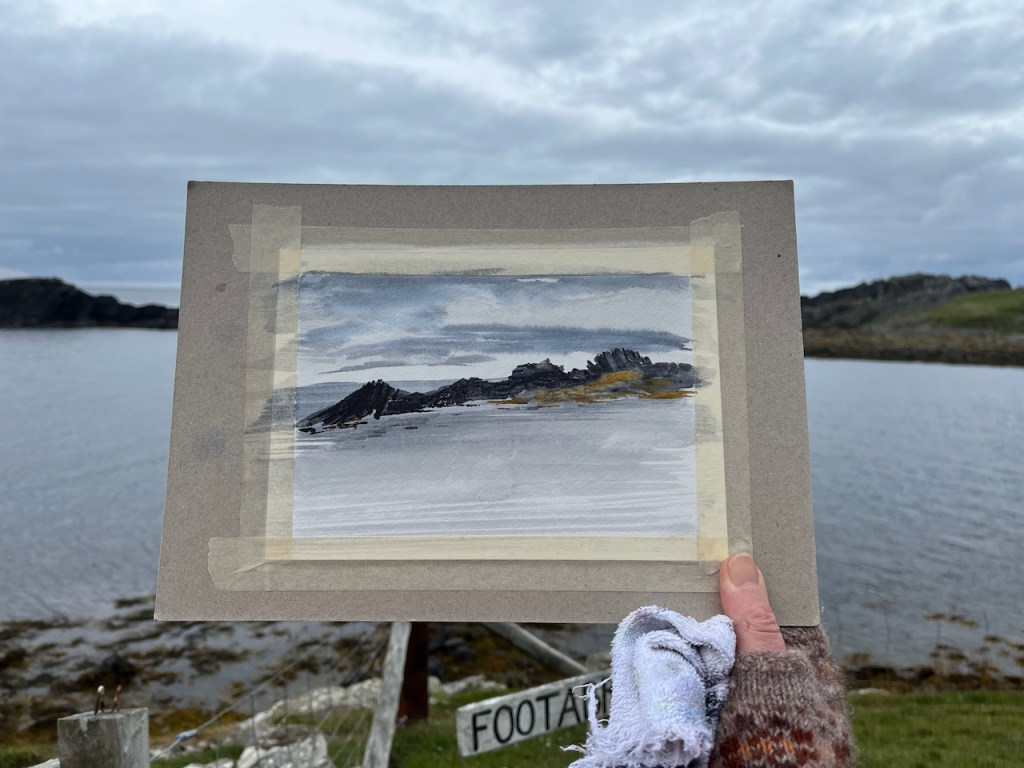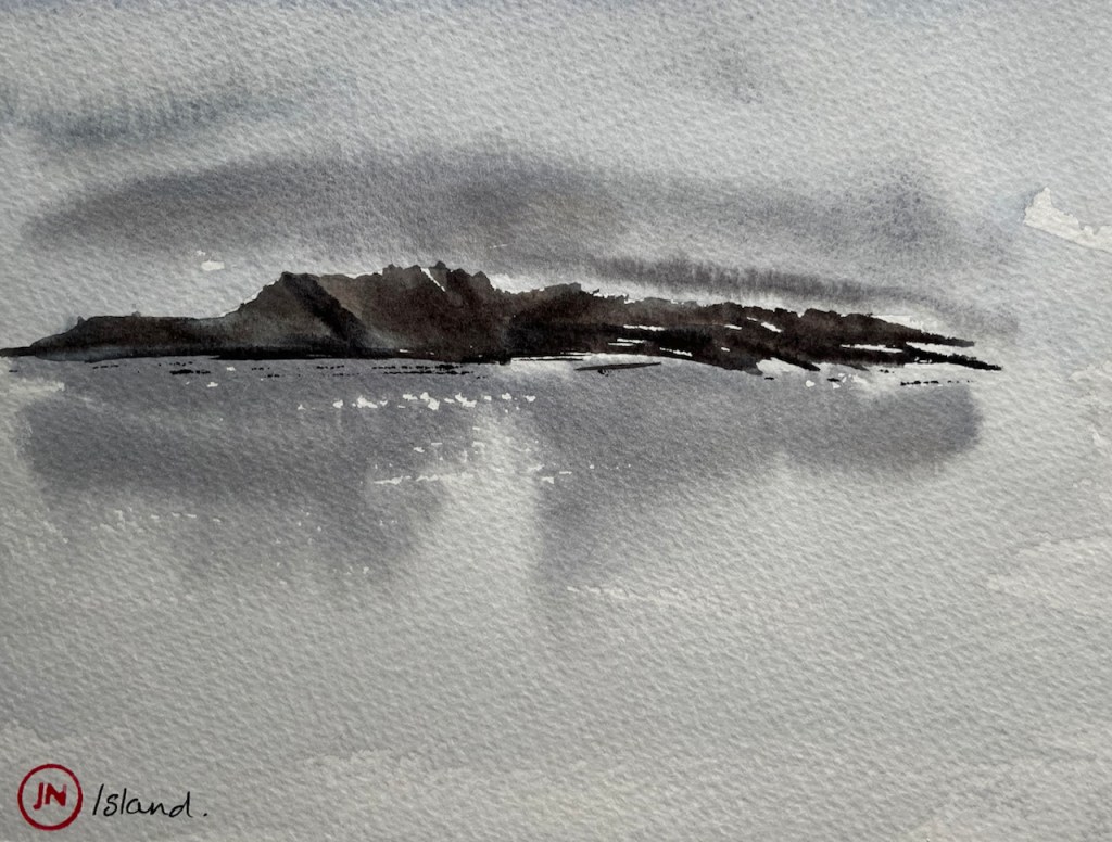 While I was drawing this picture, I was startled by a loud sneeze. Since I was totally alone on the hillside, it was uncanny. Then I realised that the sneeze came from across the water, from the seal colony at the base of the dark rocks.