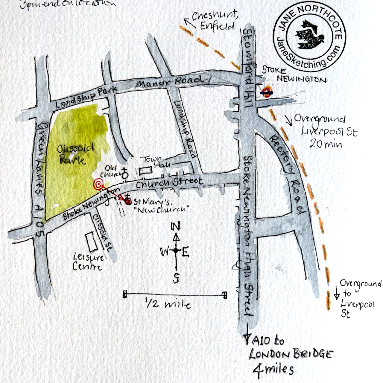 Stoke Newington is another world, even though just 4 miles from the City. My sketching location was a few yards from the gate of the park. A succession of people entered the gate and walked along the path: old and young, solitary and in groups, noisy, meditative and with or without dogs. Each person or group carefully opened the gate, then turned round and closed it again behind them. At one point, a very elderly person approached the gate in a wheelchair. Someone who had just passed through noticed them, returned to the gate, and with a respectful flourish, opened both gates wide, to allow the passage of the wheelchair, and then carefully closed the gates again afterwards. It was all very civilised, and restored my faith in the human race.