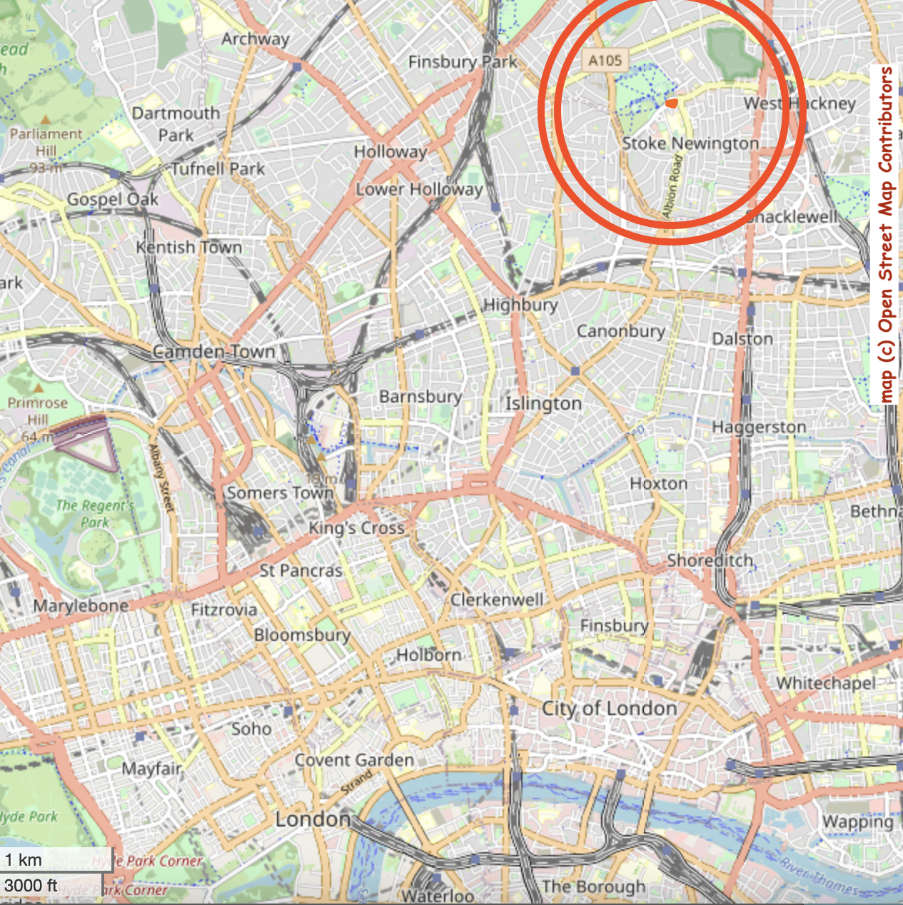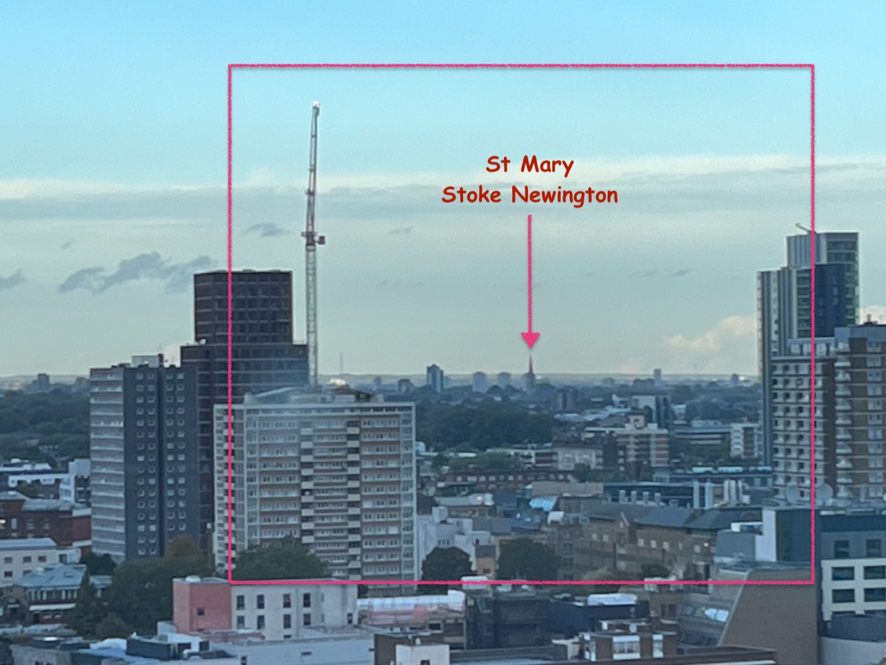 It’s just visible, on the horizon between office blocks. Some work with the binoculars and the map established that it must be St Mary Stoke Newington, some 3 to 4 miles away to the North.