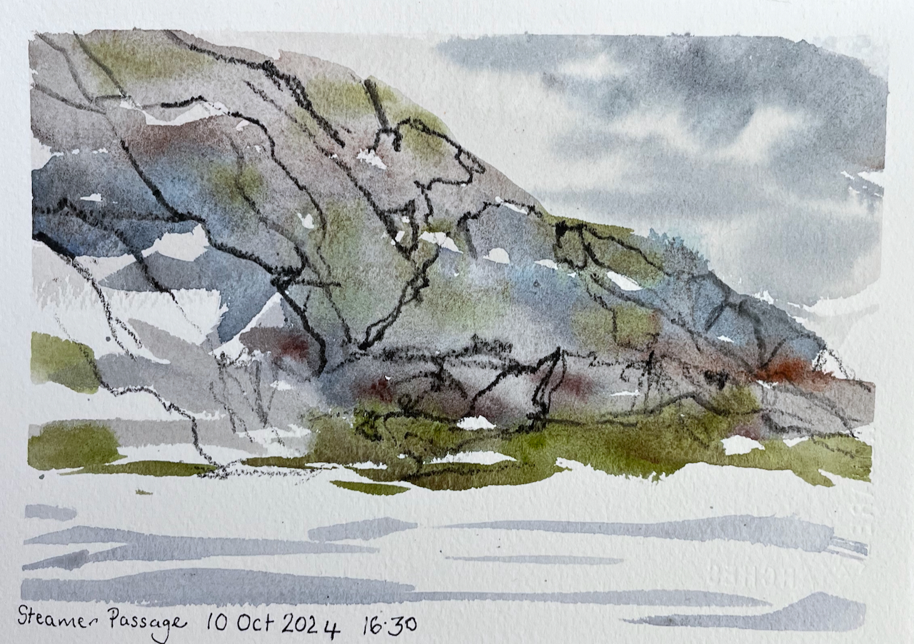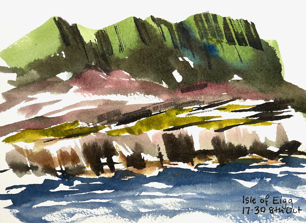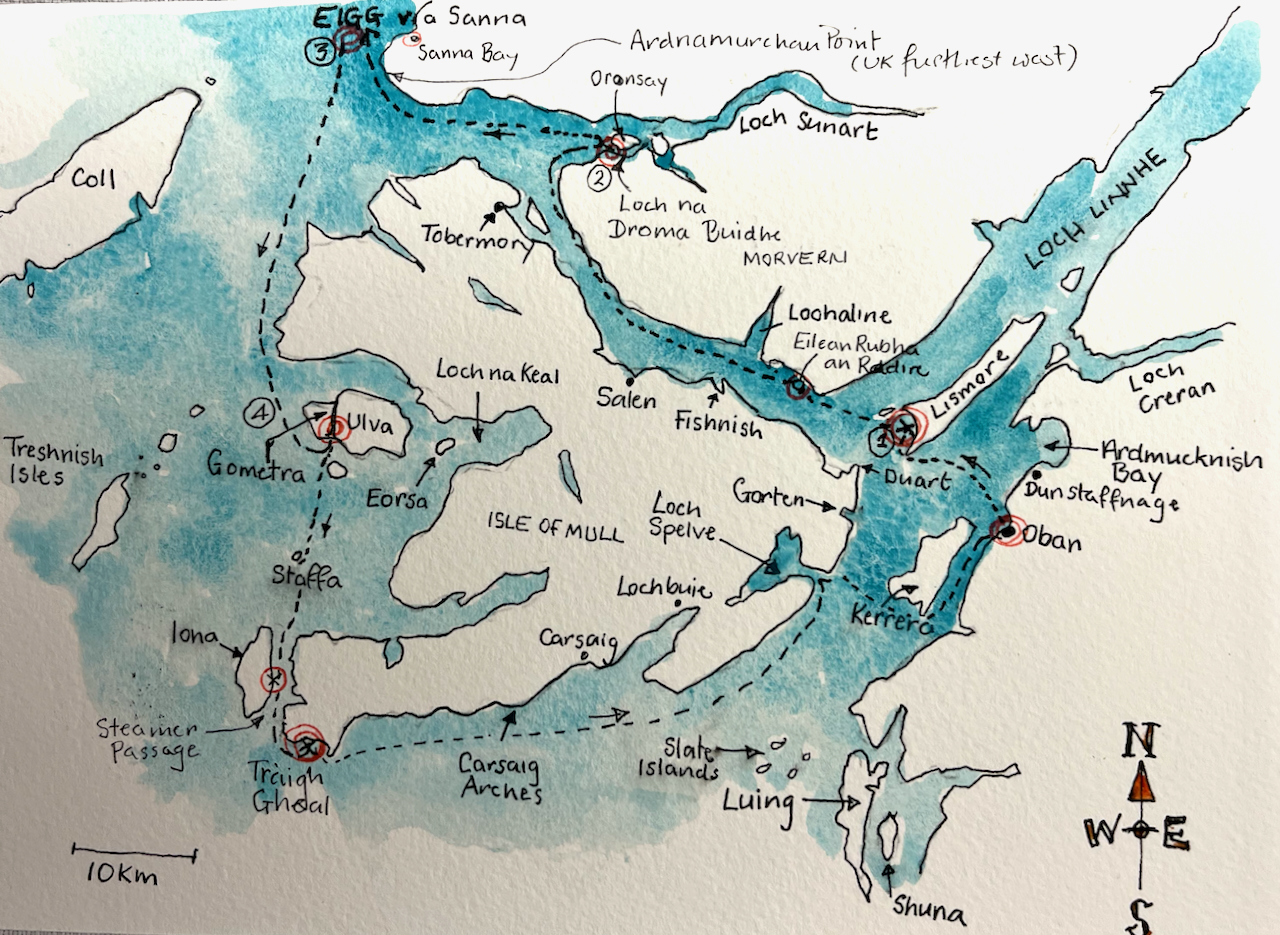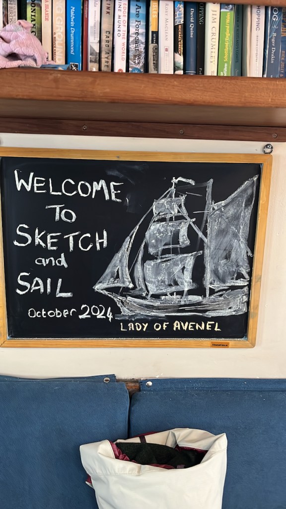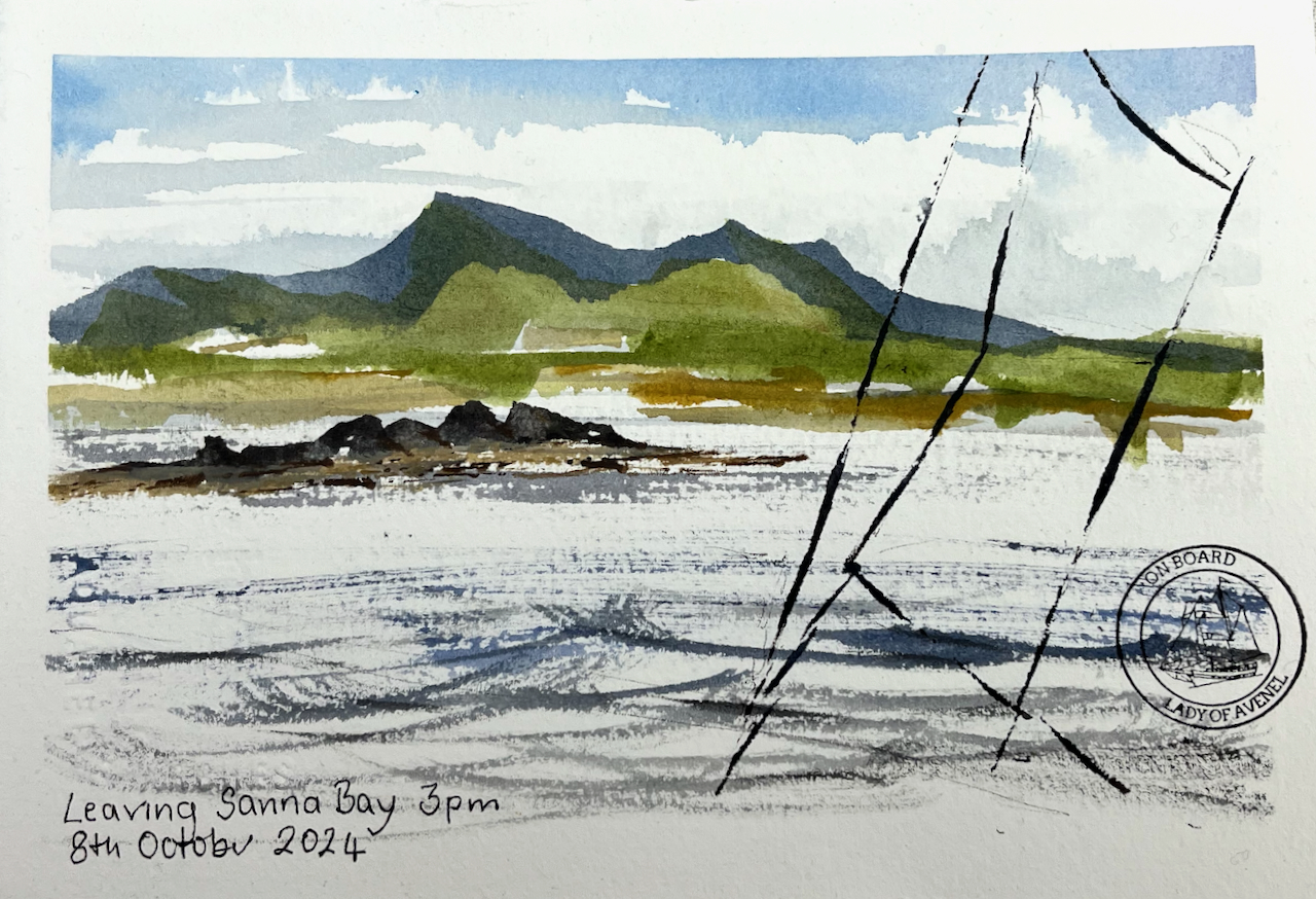 I’m just back from an invigorating week on “Sketch and Sail”with fellow artist Alice Angus and a group of guests, all sketching and learning. We were hosted by the marvellous crew of the Lady of Avenel, who managed the ship and provided all our meals. Our voyage was around the Isle of Mull in the Inner Hebrides, see maps below. We had amazing fun, laughed a lot, got wet, got dry again, got blown about, and enthusiastically sketched the experience. Everyone was very productive: lots of pictures were made, sketchbooks were filled, postcards were painted and sent.