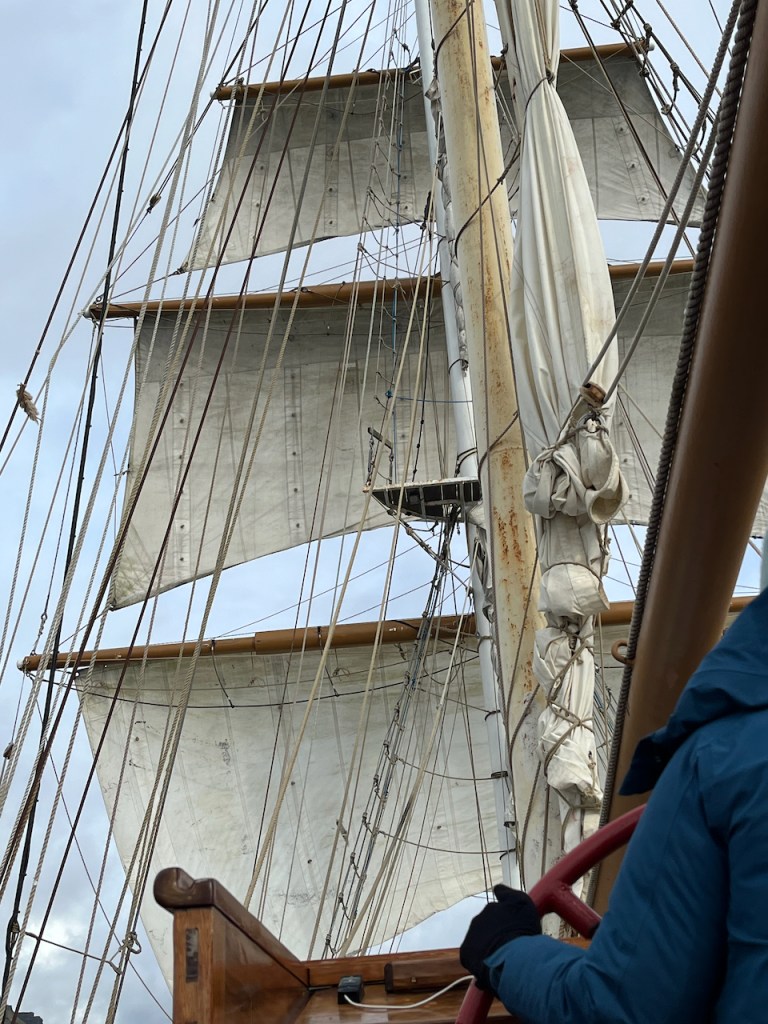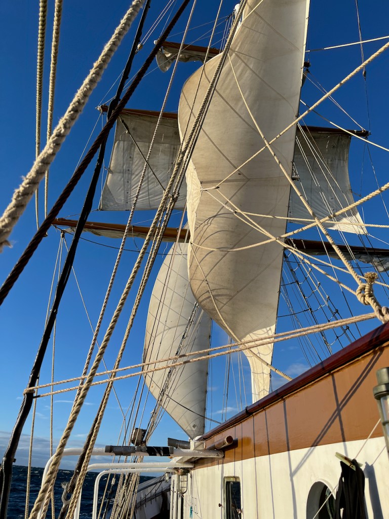 All of this was powered by a strong North Westerly wind, and Tom’s cooking. Tom continued cooking even as the North Westerly gusted Force 7, and produced a hot meal for hungry sailors every evening, soup for lunch and cooked breakfasts. He made the sour dough bread every day in the ship’s galley. I found this hugely impressive.