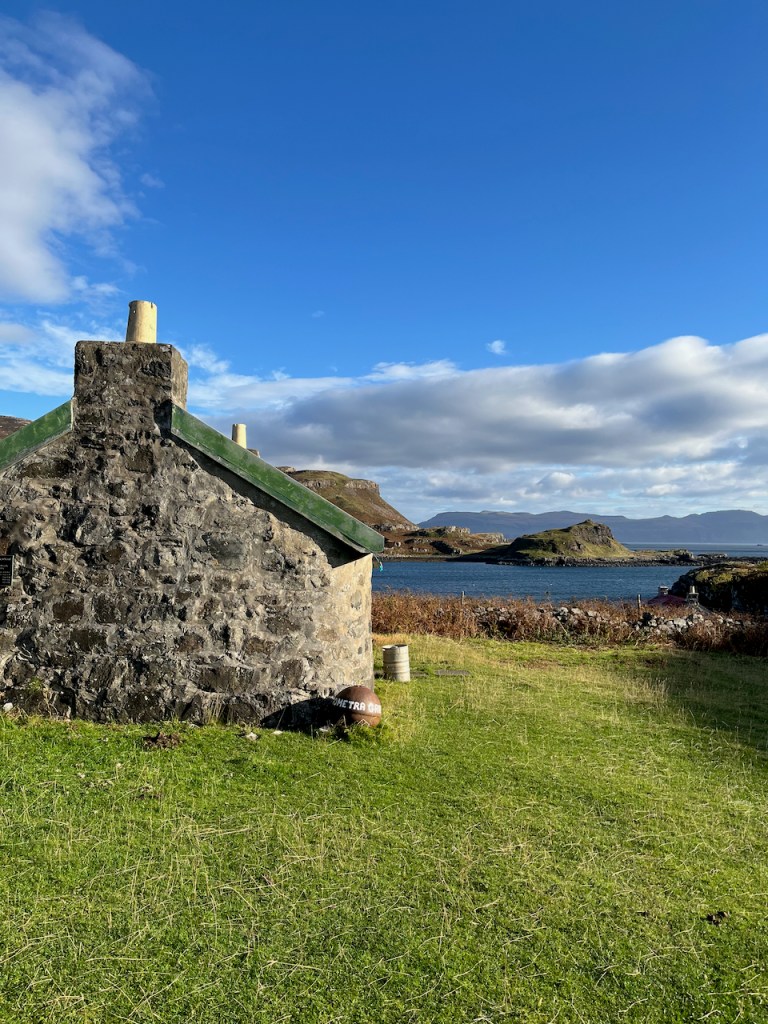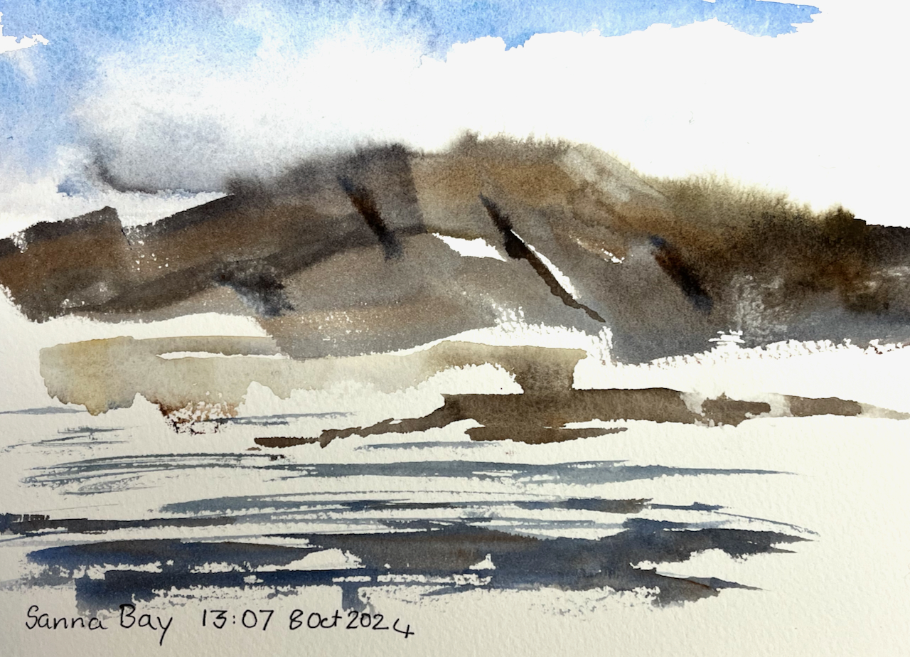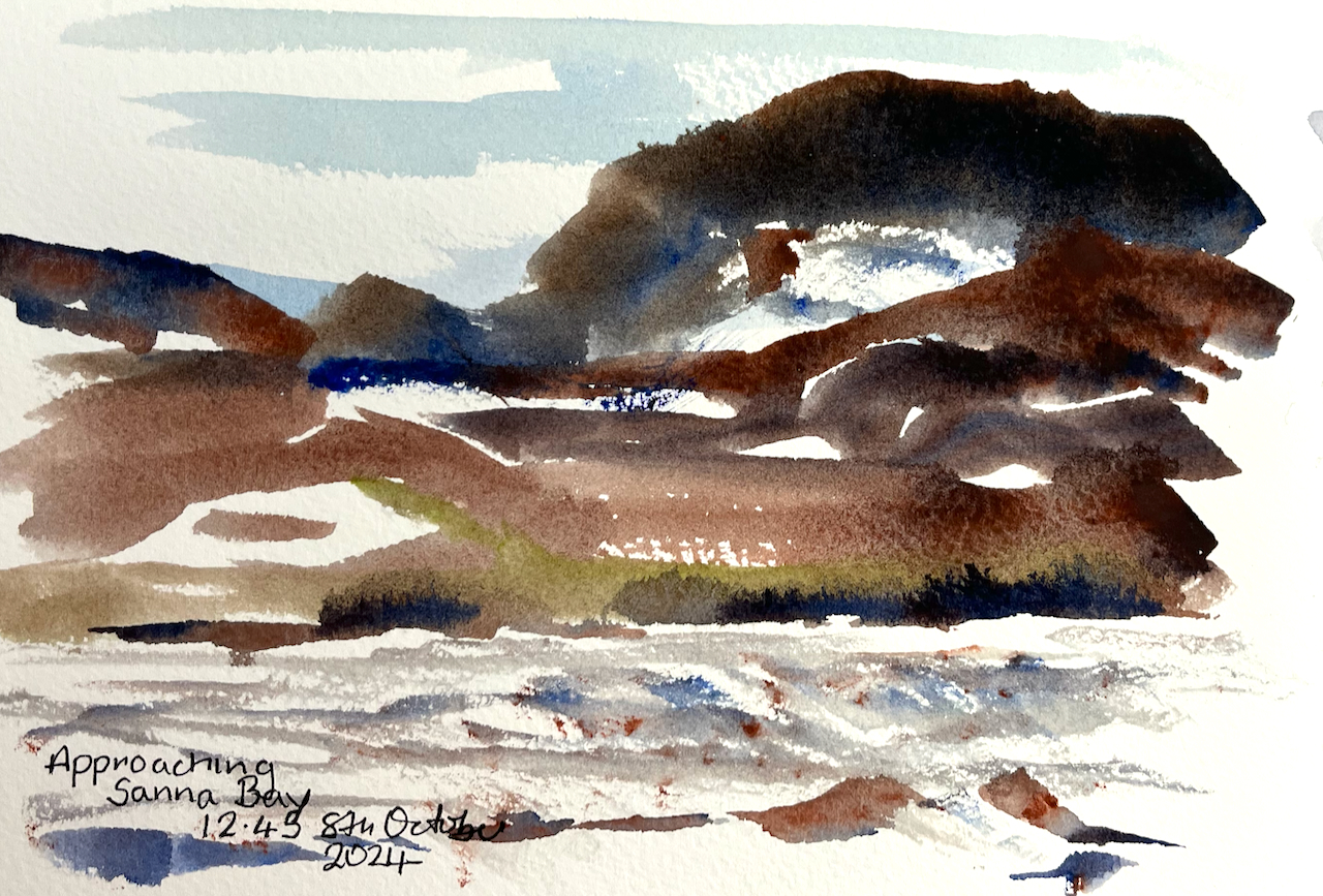 At Sanna Bay there is a large sandy beach, and a settlement of a dozen or so cottages. Here is a sketch made as we approached Sanna Bay:
