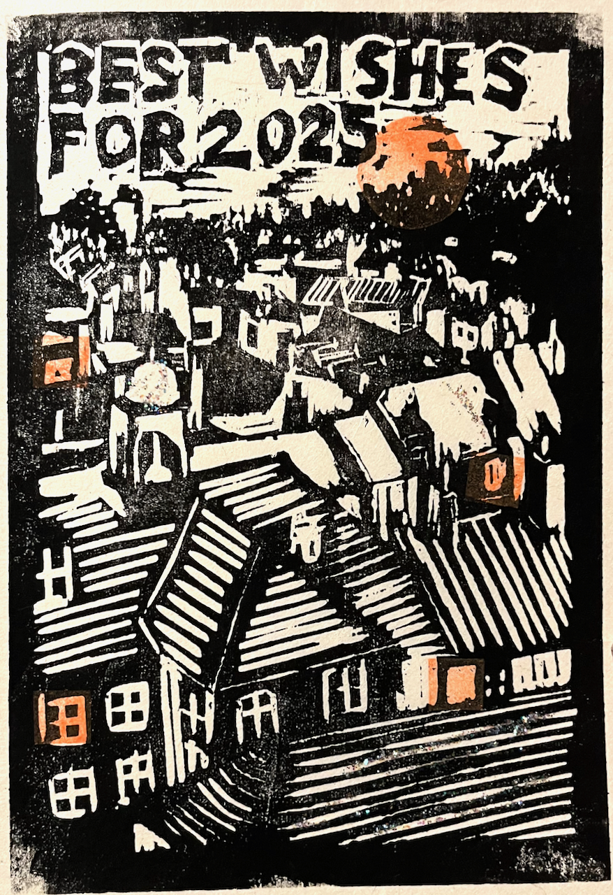 Happy New Year! This is a woodcut, based on the rooftops of the town of Rye, in East Sussex. Bedroom becomes print studio. Many good wishes for 2025! Glad, as the years pass,that I am grantedanother evening.