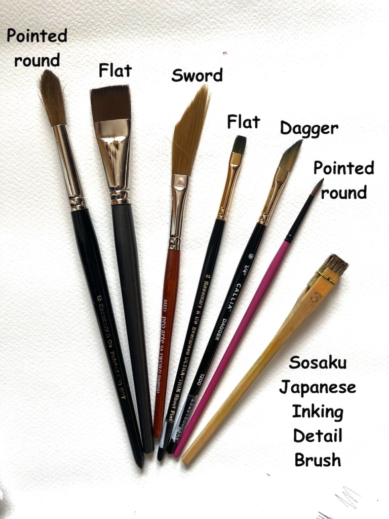 Here are the brushes I use. Mostly I used the large flat brush, which is from Rosemary Brushes. It is about an inch across.