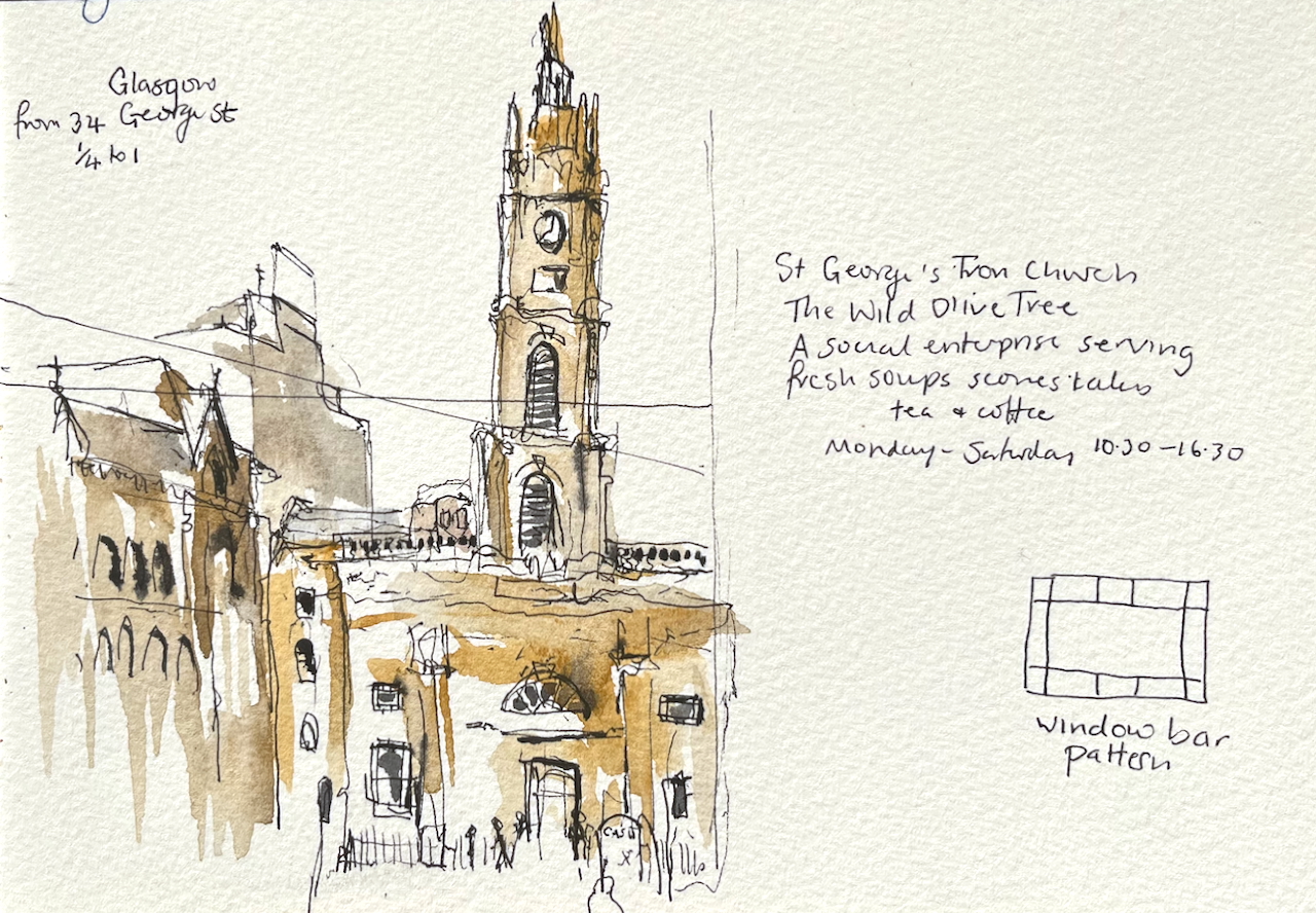 On the way to and from Sketch and Sail last week, my journey took me through Glasgow. I spent a few hours walking around that city, sketchbook in hand. Here is West George Street, looking east, downhill towards St Georges Tron Church. This was a Sunday. Glasgow was quiet. Until there was the sound of … Continue reading Walking around Glasgow