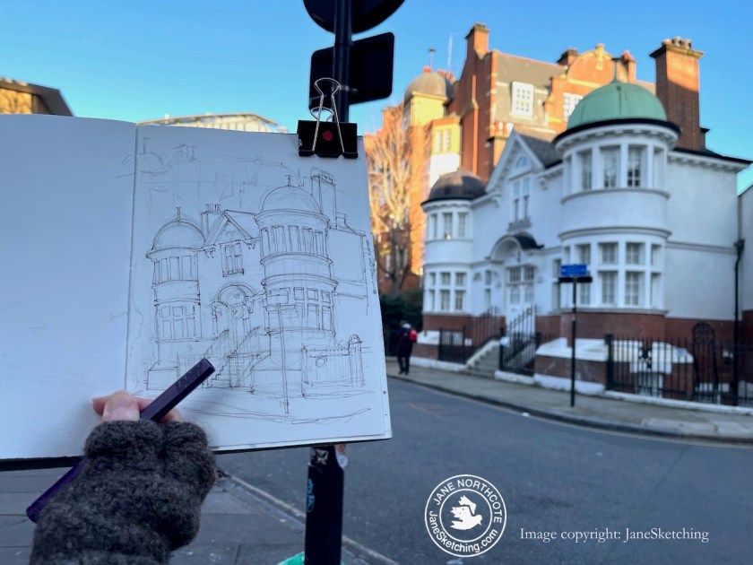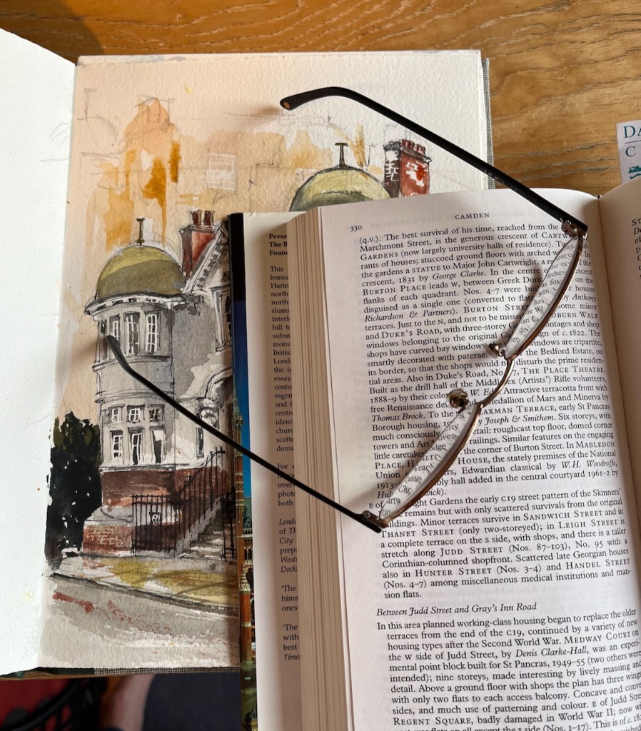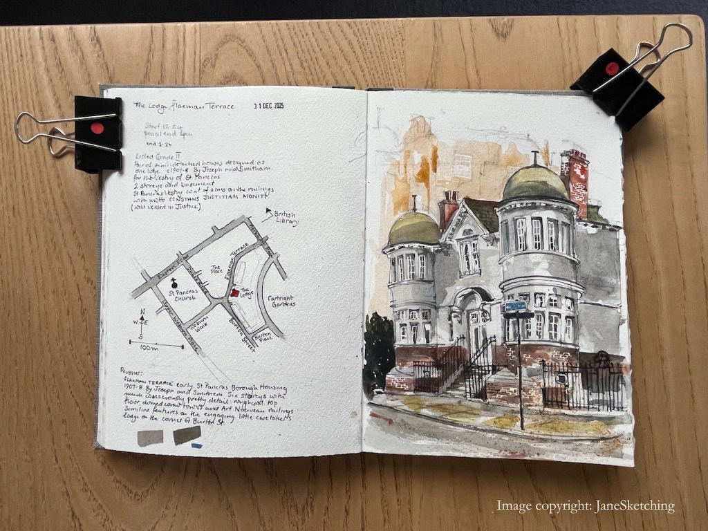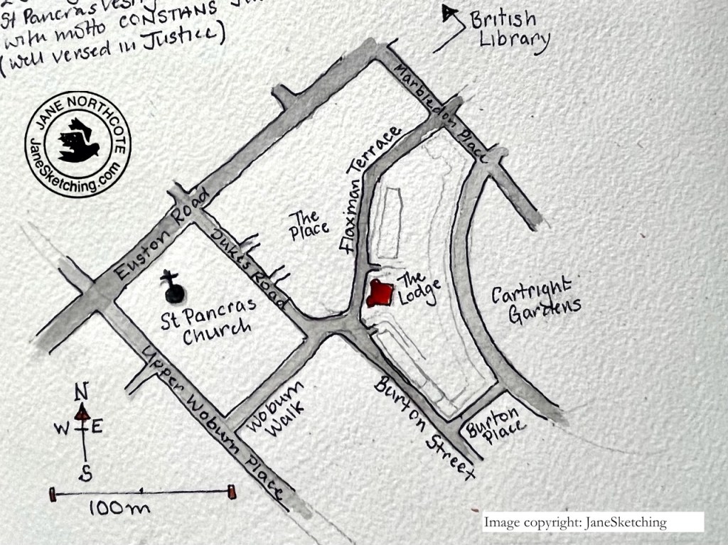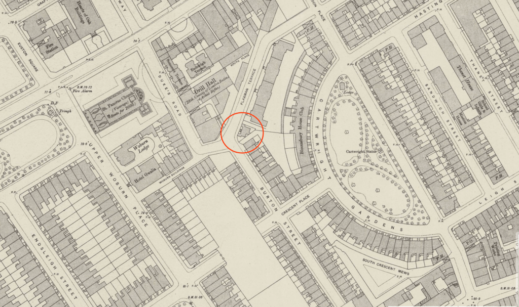 I sketched this building standing at the corner of Flaxman Terrace and Woburn Walk. “Woburn” would imply a possible burn or stream. Sure enough, the marvellous “British History Online” site delivers a map showing a stream in this location: