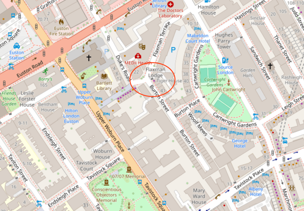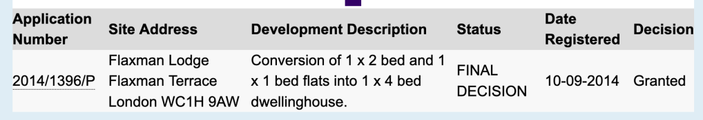 Now Flaxman Lodge appears to be a private house. Evidently at one time it was divided into flats. Planning permission to convert the flats into one “4 bed dwelling house” was granted by Camden Council in 2014, application reference 2014/1396/P