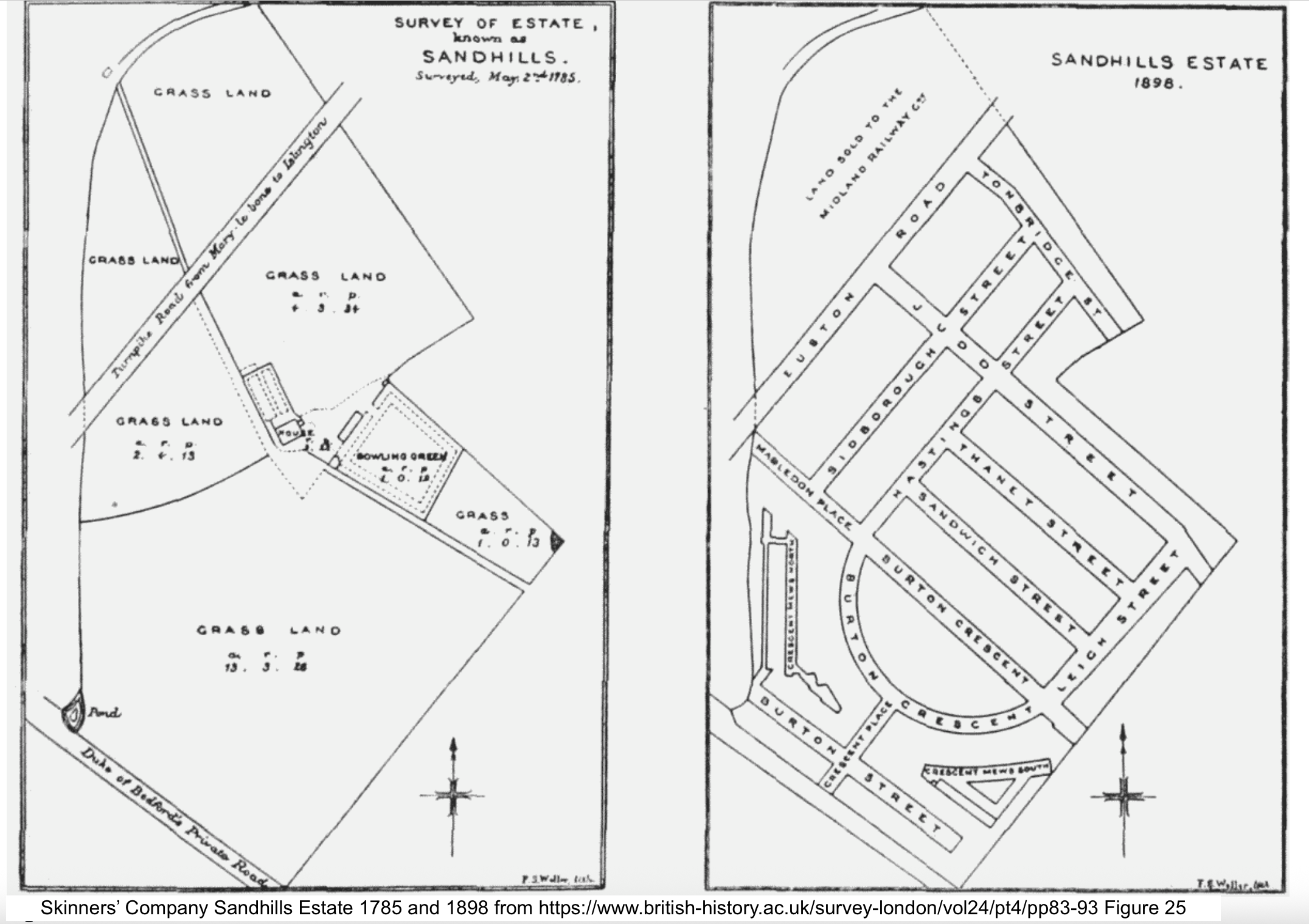 I was standing in roughly the position of the “pond” shown in the 1785 map on the left. At that time, I would have been surrounded by fields. By 1898, urbanisation had arrived, but not yet this Lodge. The routes of old byways and street boundaries are retained. Here’s a 1942 map3, by which time the Lodge has appeared. The street pattern of 100 years previously is still there.