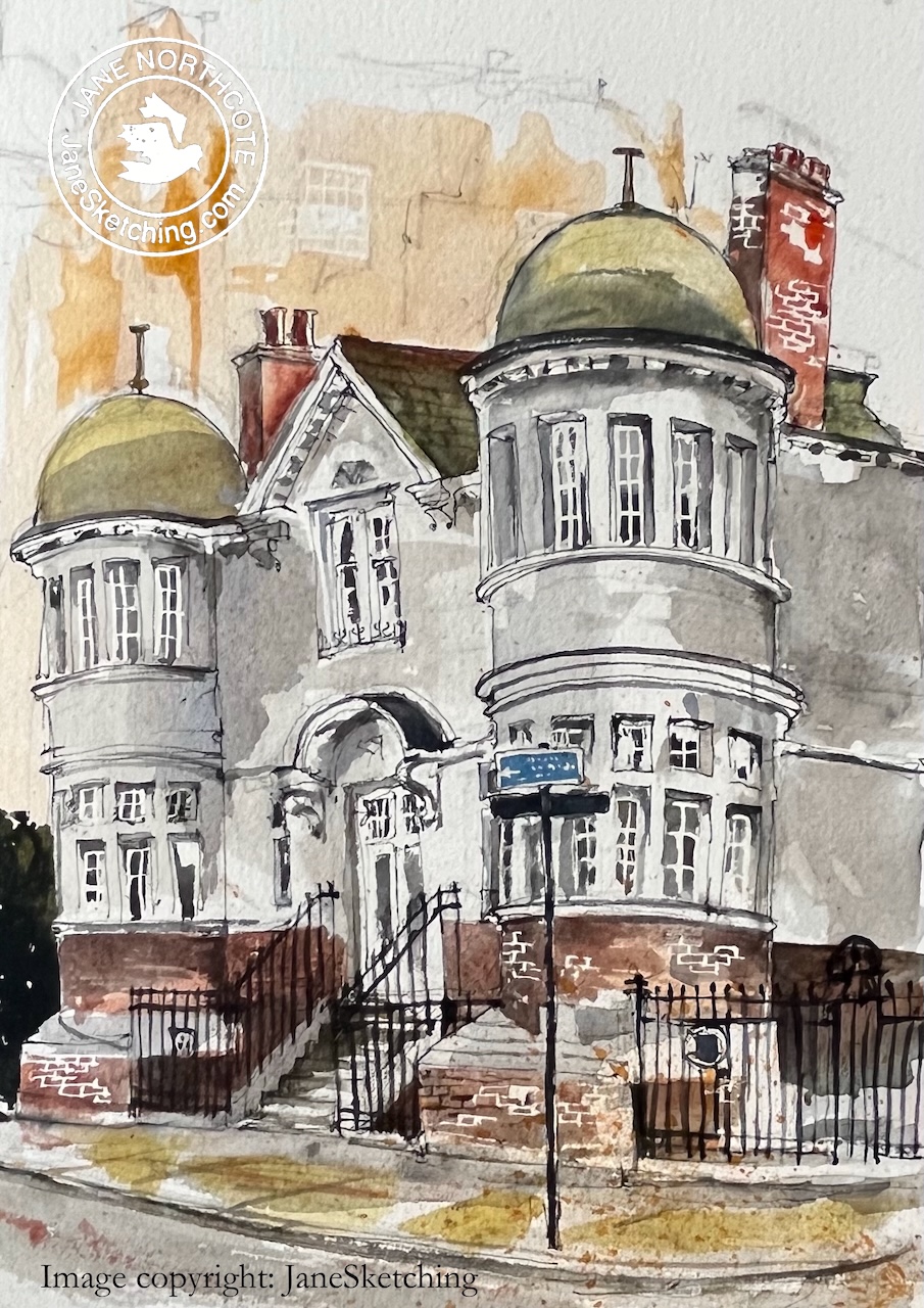 I sketched this building standing at the corner of Flaxman Terrace and Woburn Walk. “Woburn” would imply a possible burn or stream. Sure enough, the marvellous “British History Online” site delivers a map showing a stream in this location: