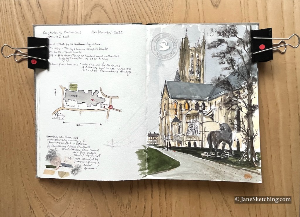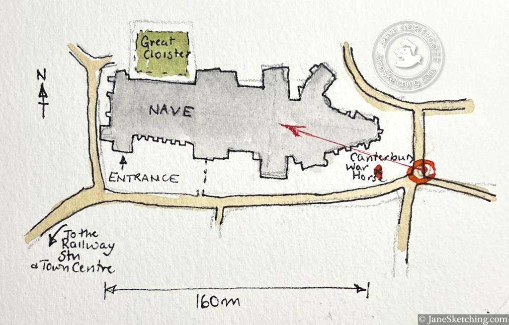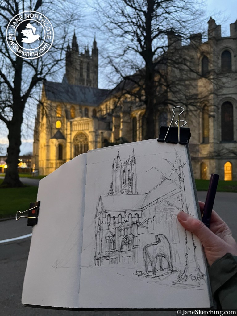 I was sketching the cathedral from the south west. The Tower in the centre of my sketch dates from 1478. The Trinity and Corona chapels on the right of the picture were built in 1175 and 1184. The magnificent nave, under the grey roof in the centre of my sketch, was built in 1377-1405. The cathedral was founded in 597 by St Augustine.