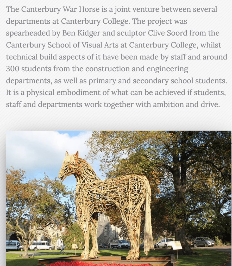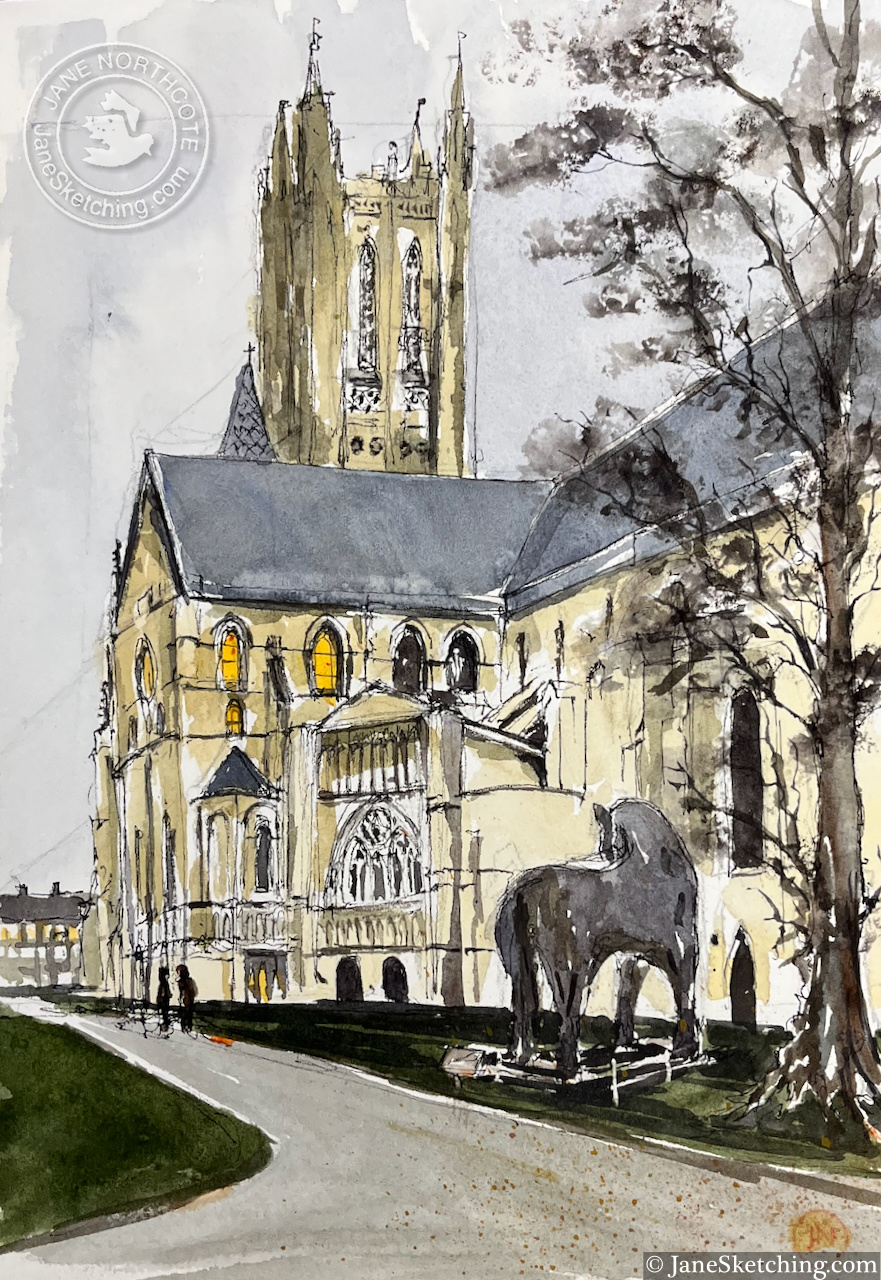 The horse in the foreground of my drawing is the “Canterbury War Horse”. It is made of pieces of wood, offcuts donated by the local fencing business, Jacksons. It was created in November 2018, marking Armistice Day, and the centenary of the end of the 1914-18 conflict.