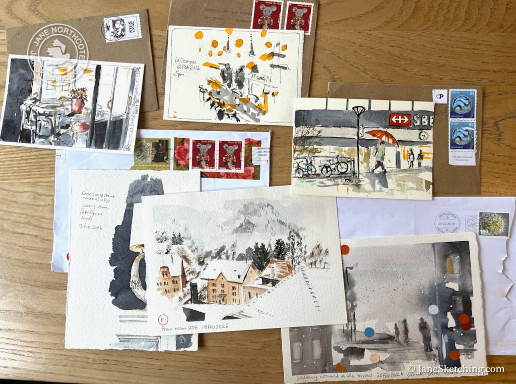 These sketches are all postcards, which I dropped into letterboxes as I travelled. My friend kept them all, and the envelopes.