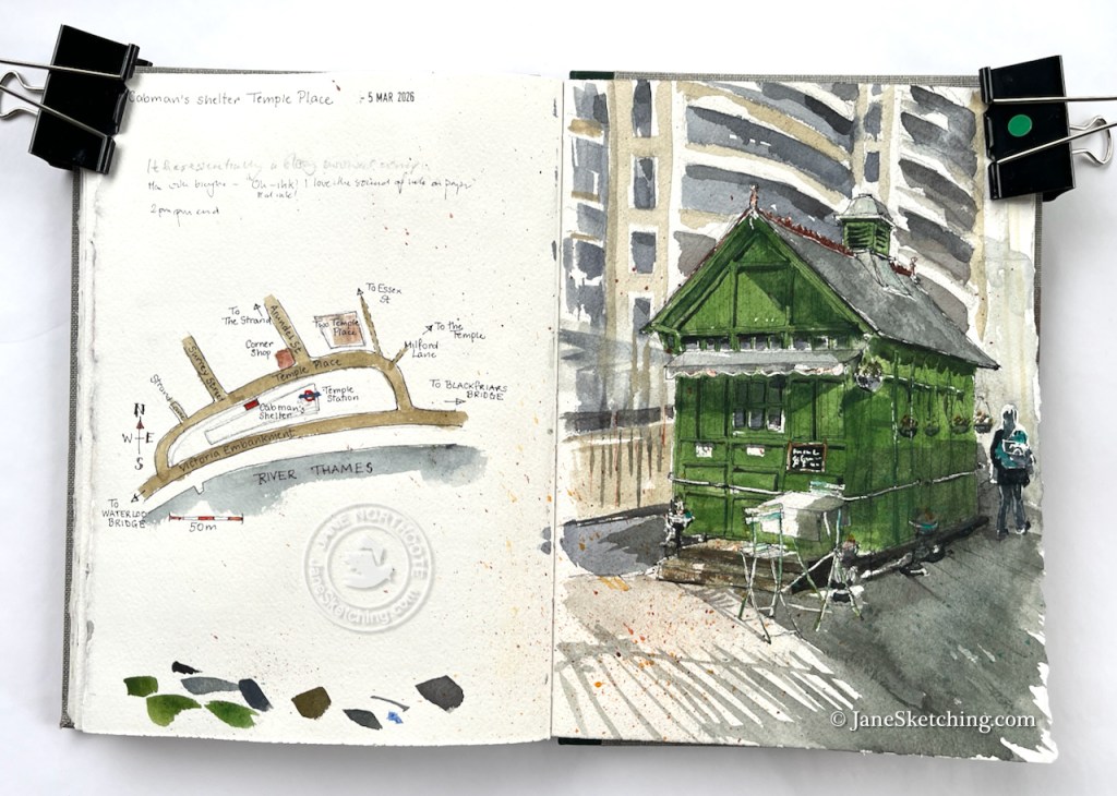 Here is the sketchbook spread. My aim is to sketch more of these shelters – maybe even to sketch all of them.