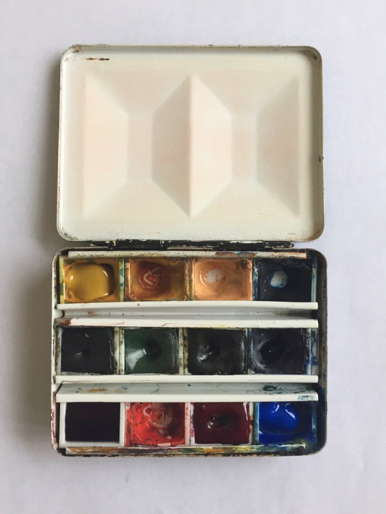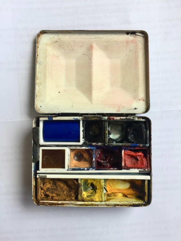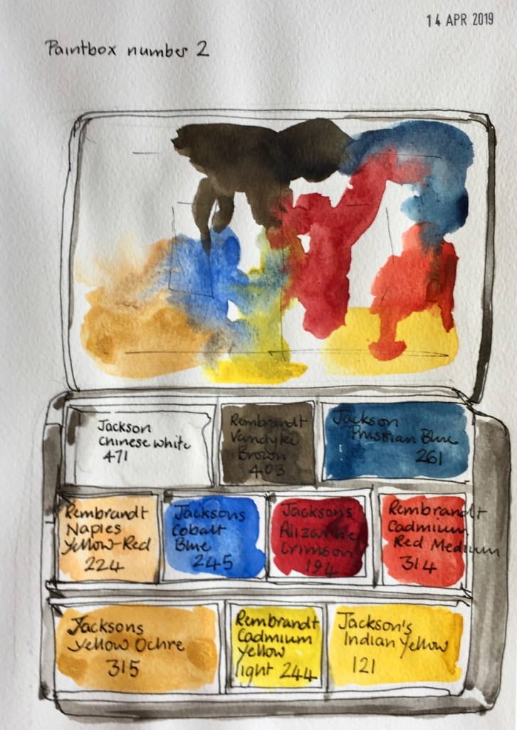 After a lot of use in Crete I topped up the Indian yellow from a tube, and replaced the Prussian blue with another pan I had. The Raw Sienna had been a hard colour to use, it doesn’t dissolve. So I removed it, and used the space for a random colour: Mauve , Rembrandt colour number … Continue reading “Watercolour Box 1 – May 2019 update”