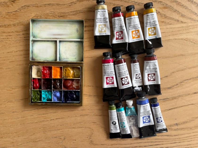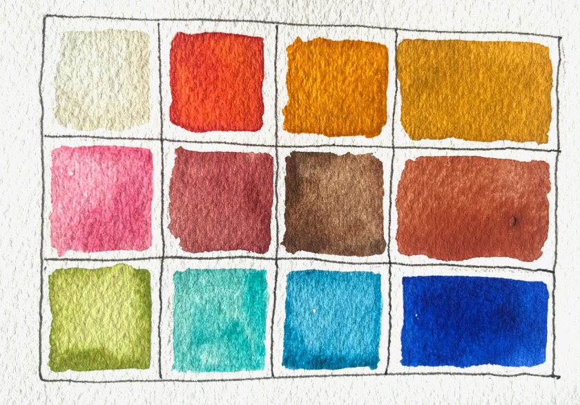 I refreshed the colours in my palette. This watercolour palette is by David Cooper of Classic Paintboxes: see my article about this box. Here is the updated colour list. I moved the Fired Gold Ochre to a bigger space. There are three new joiners, and three colours are moved out. The three that moved out … Continue reading “Watercolour Box update – 16th April 2021”