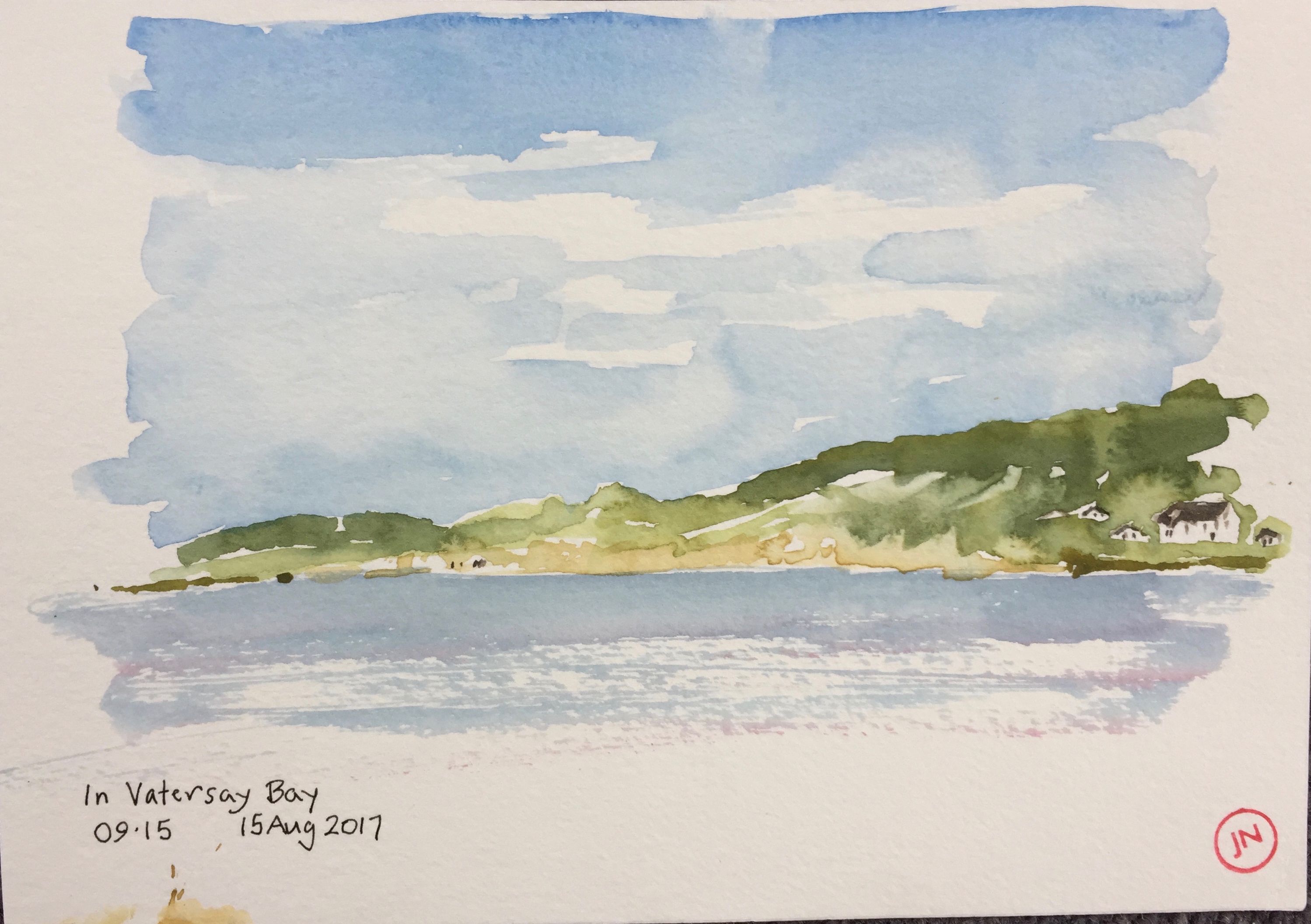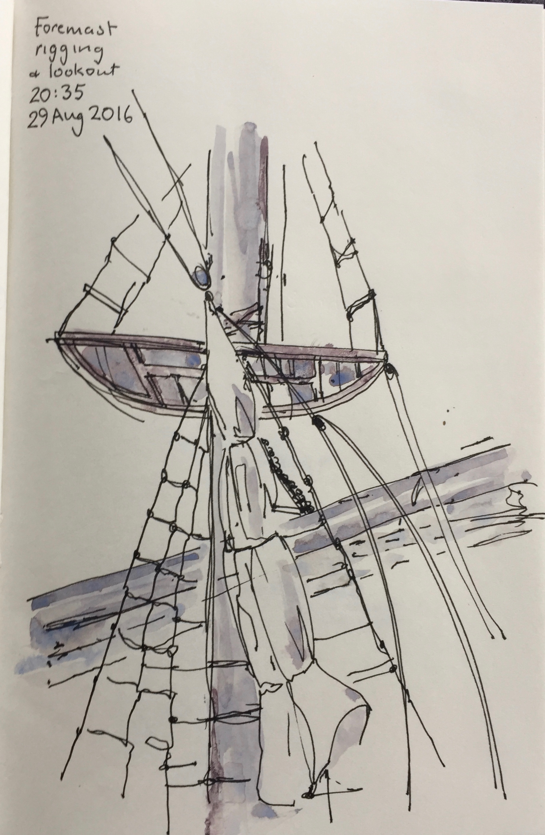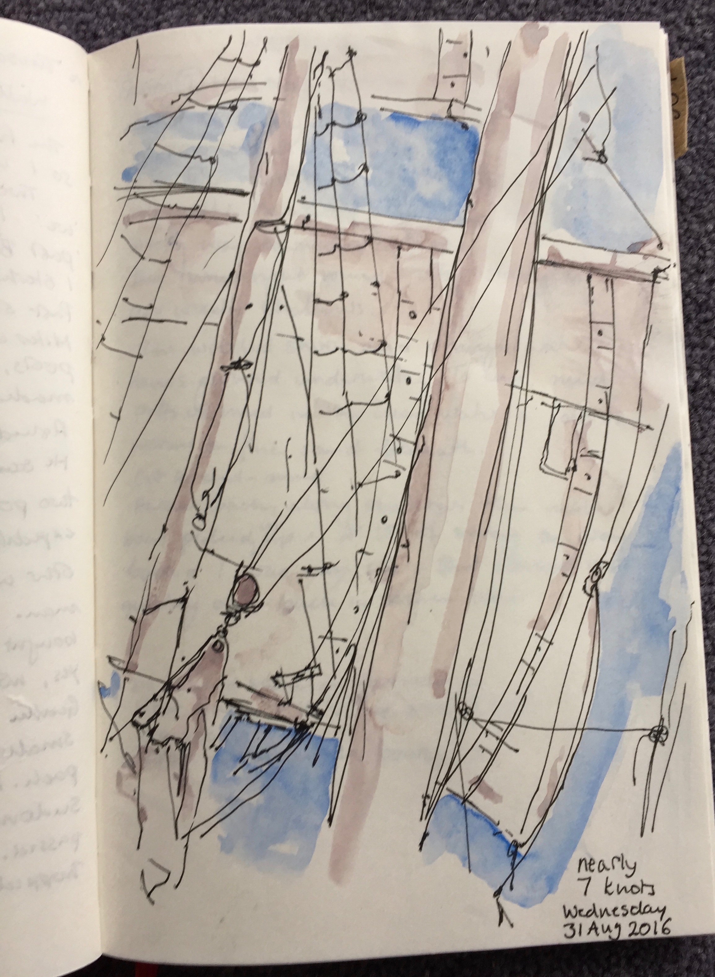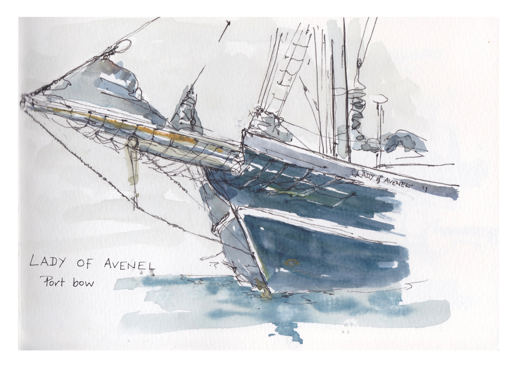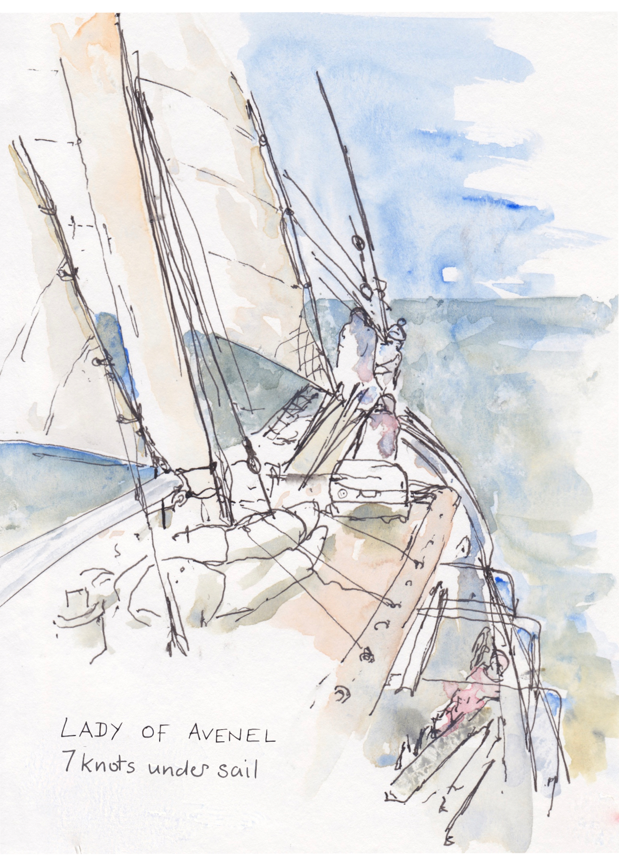 Bracing myself against the wood of the ship, being aware of the movement, and being even more aware of the need to catch the moment before the sails were struck, the island disappeared, or the rain came down, this was my journey on the Lady of Avenel. And it was watercolours, and permanent ink. These are hard things to manage when everything is moving around. But it’s possible. I found it was possible. The important thing, for me, was simply to do it, to put pen to paper, to put the colour down, to look up, to look out and to see.