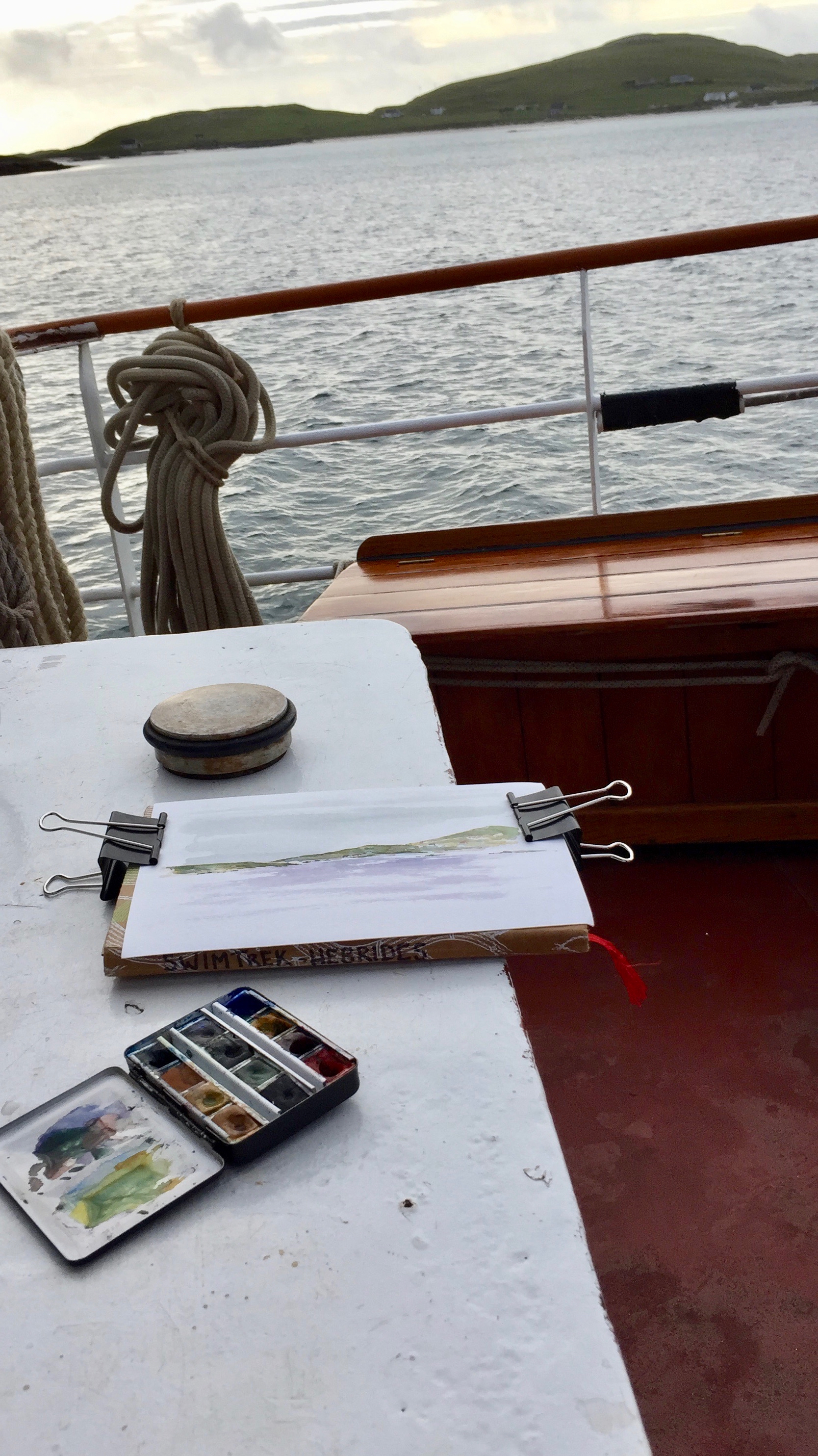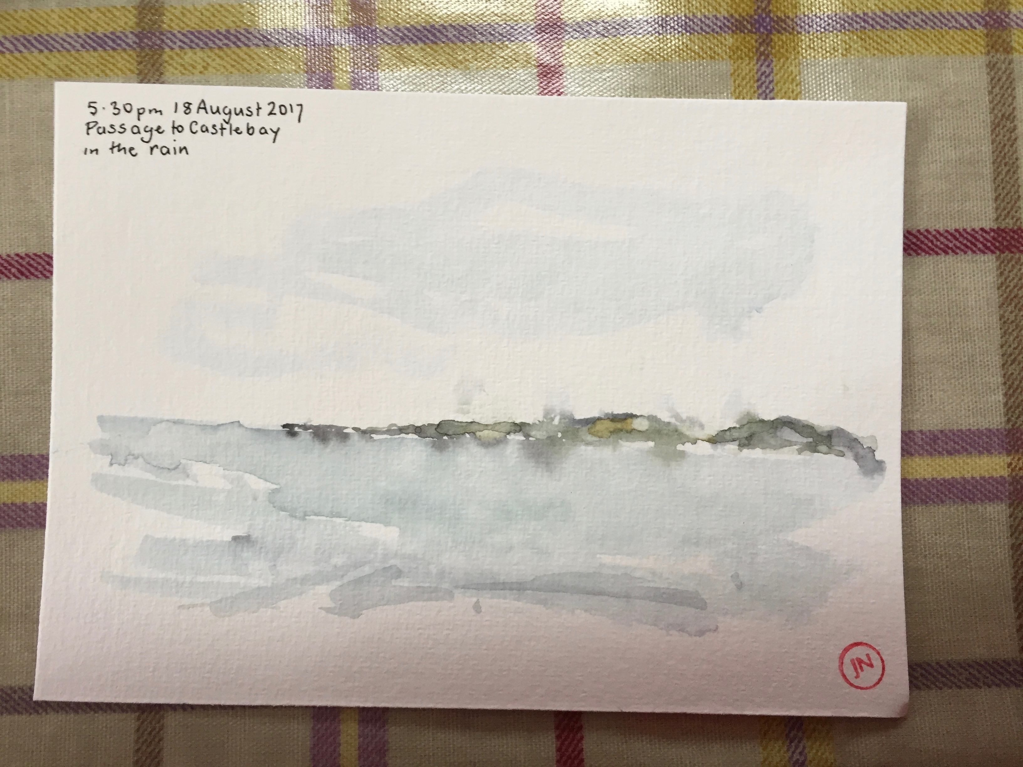 I took my sketching kit on the Lady of Avenel swimming expedition. Water – watercolours – moving ship – paper – wind – rain – would it work?