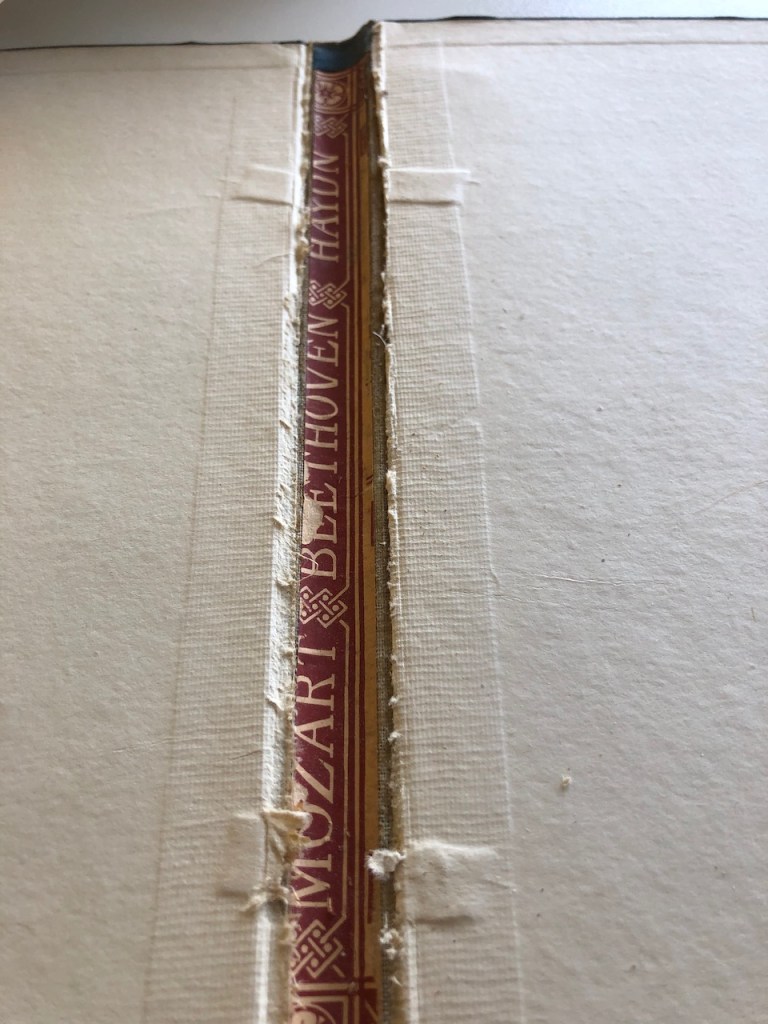 So I looked carefully at the construction of the score, and used a combination of “coptic binding” and an improvised sewing method incorporating ribbons, to sew the watercolour sheets together. Then I removed the music from the score, and put in the watercolour paper. Here are some pictures, click to enlarge: