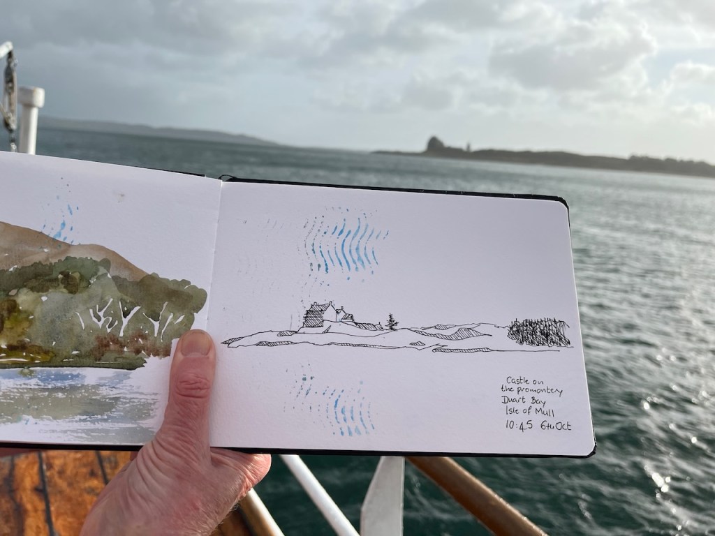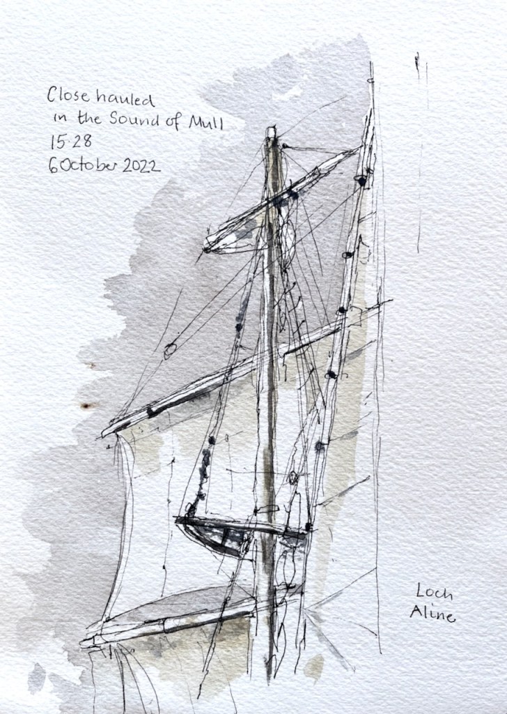 I’m just back from an invigorating week on “Sketch and Sail”with fellow artist Alice Angus and a group of guests, all sketching and learning. We were hosted by the marvellous crew of the Lady of Avenel, who managed the ship and provided all our meals. Our voyage was around the Isle of Mull in the Inner Hebrides, see maps below. We had amazing fun, laughed a lot, got wet, got dry again, got blown about, and enthusiastically sketched the experience. Everyone was very productive: lots of pictures were made, sketchbooks were filled, postcards were painted and sent.
