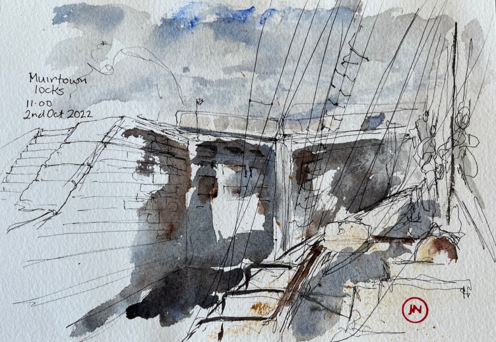I sketched it in pen on location. Part way through the process, a group of workers started to clean the area behind me, using high-pressure water hoses. A fine mist appeared in the air, adding to the general dampness. I finished the drawing later that evening, in my warm dry room.