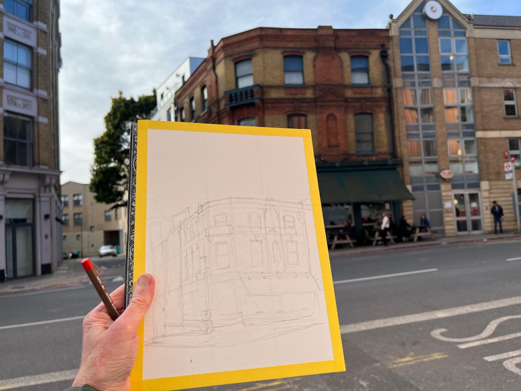 Why not do the drawing right here? Over the other side of the road is a building occupying an acute angle between roads. It wasn’t in my plan, but by this time I had abandoned my plan. So here is 38 Charterhouse Street, sketched from the shelter of the Smithfield Meat Market canopy.