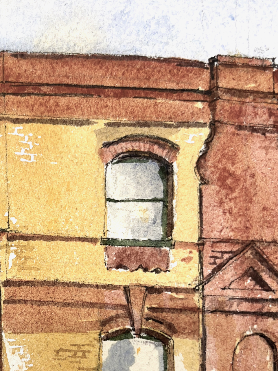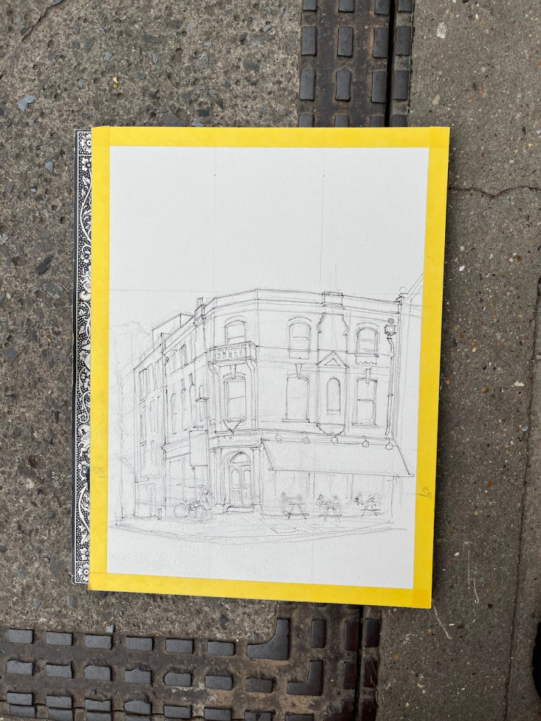 38 Charterhouse Street, photoDrawing in progress on locationDetail of finished drawingThis was where I was standing to sketch, this area was cleaned with high-pressure water hoses.