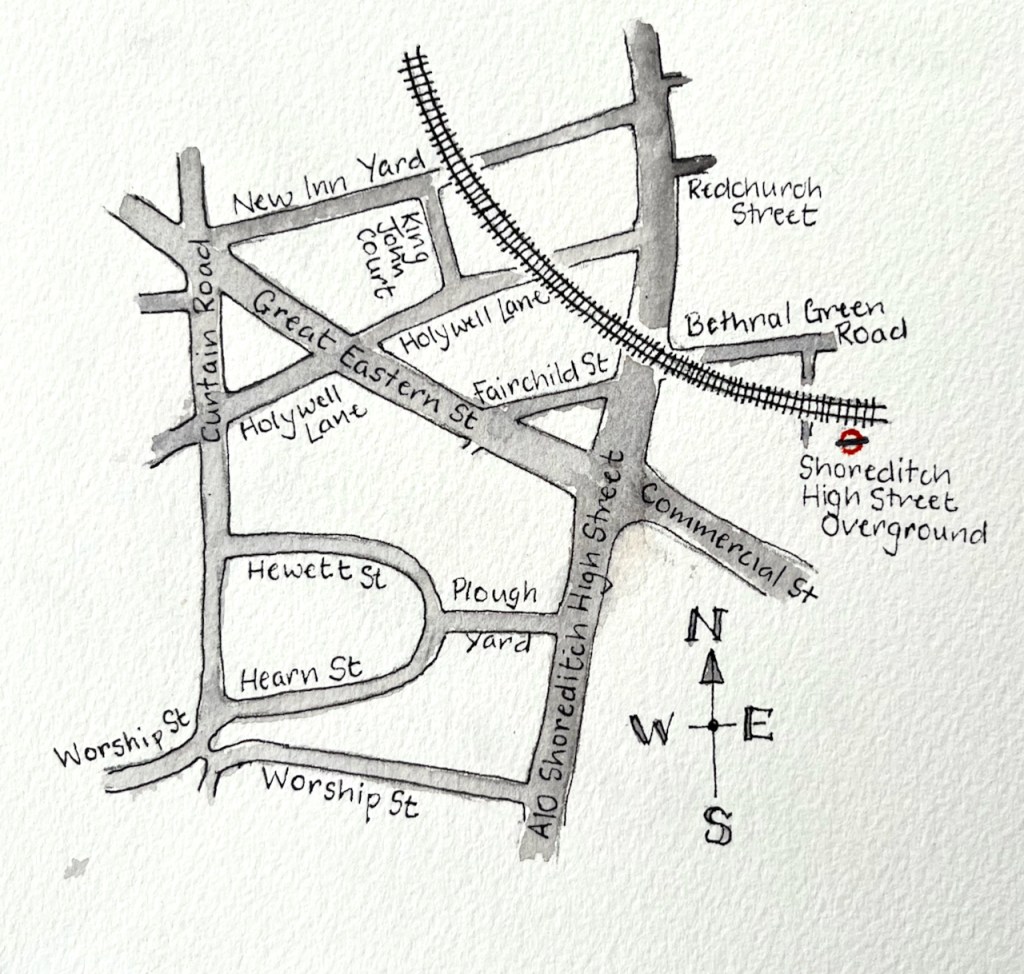 The Fox and Anchor pub and the former cold stores are on the left of my drawing. I’ve drawn the marvellous frontage of the Fox and Anchor here.