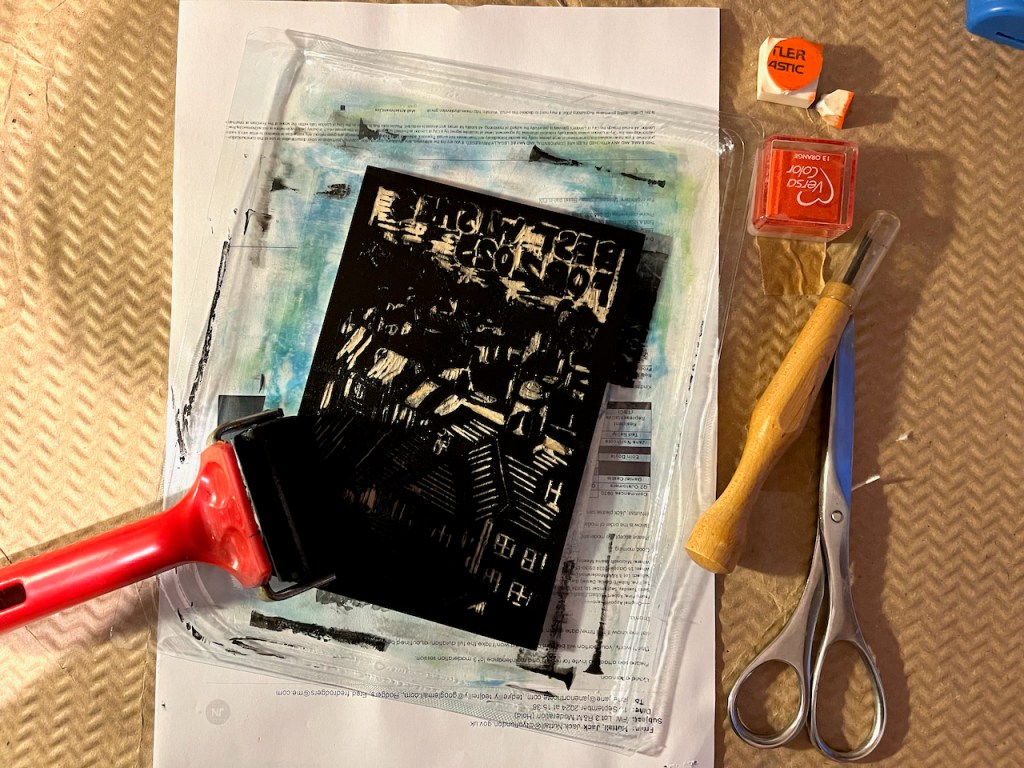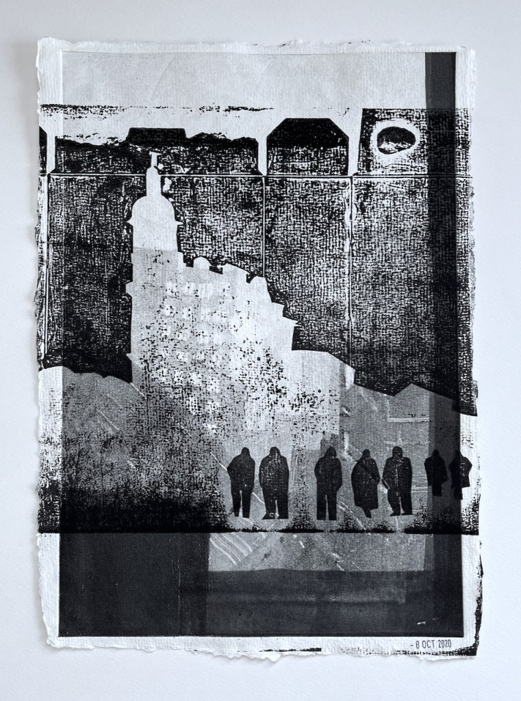 Sometimes in the printing process, magic happens. As I was packing for this print session, searching for paper, tissues, gloves, and other printing essentials, I encountered a thick envelope labelled “Old Prints”. I pulled out one of those, a street scene, with a vague idea of overprinting it. It is a drypoint I made years ago. The vague idea turned into a plan, and then a print. Here it is. I was really pleased with how it came out. The chine-collé is also a leftover from another project.
