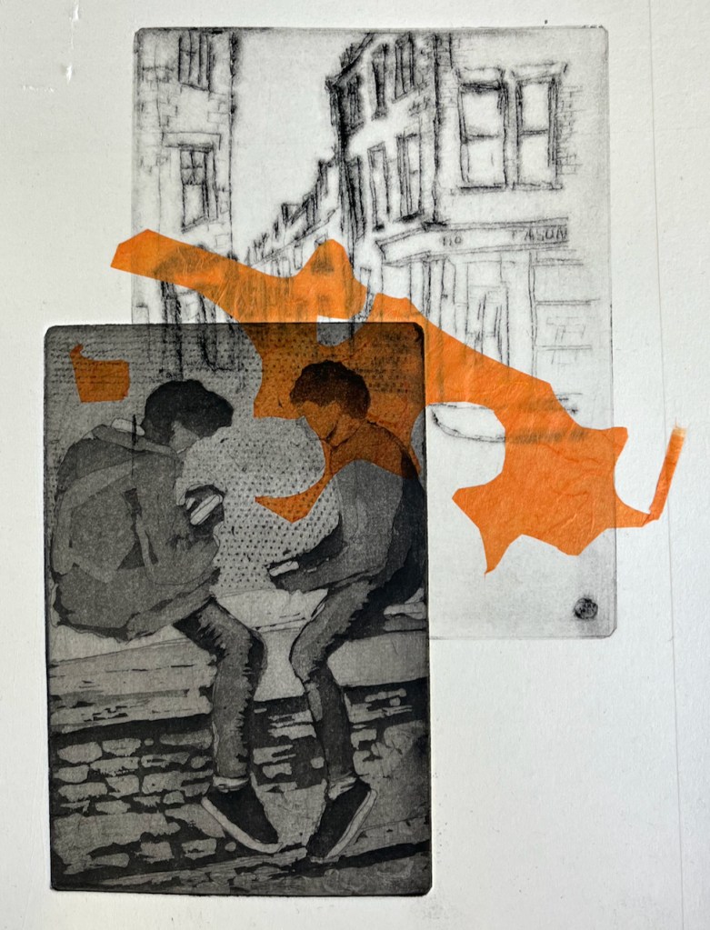 Two boys and street, combined image size about A5. Etching, drypoint and chine-collé.