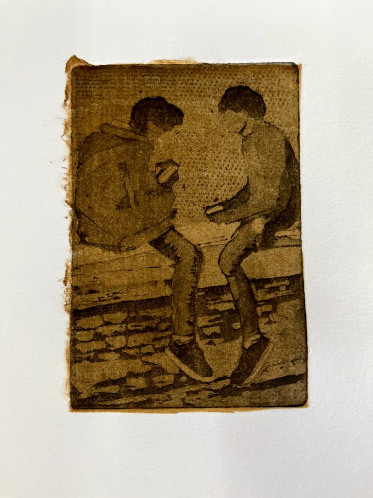 Two boys, etching, image size about 5inches by 3inches