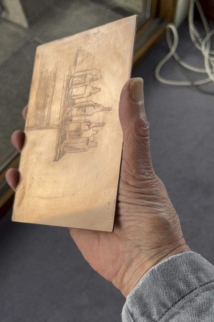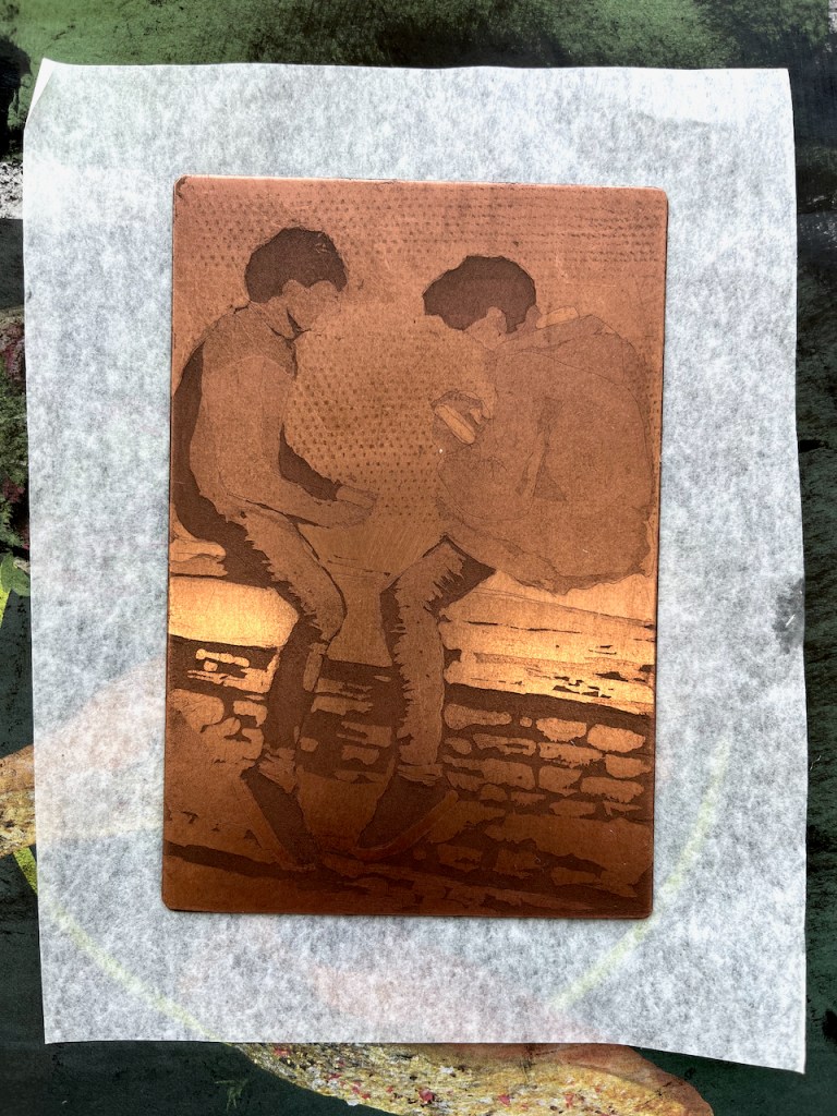 It is printed on Fabriano Unica paper, using Charbonnel F66 traditional etching ink. Here is the copper plate: