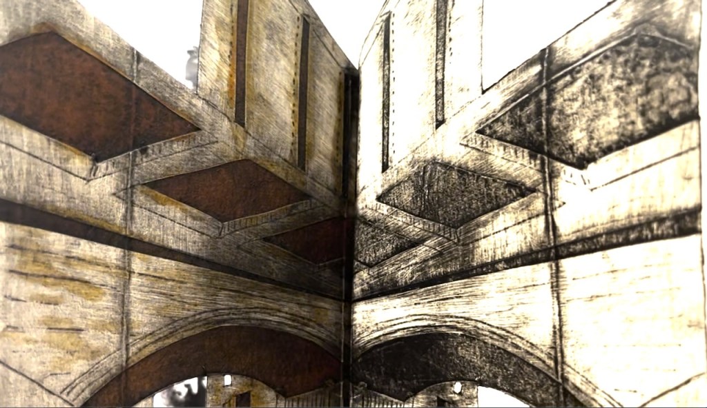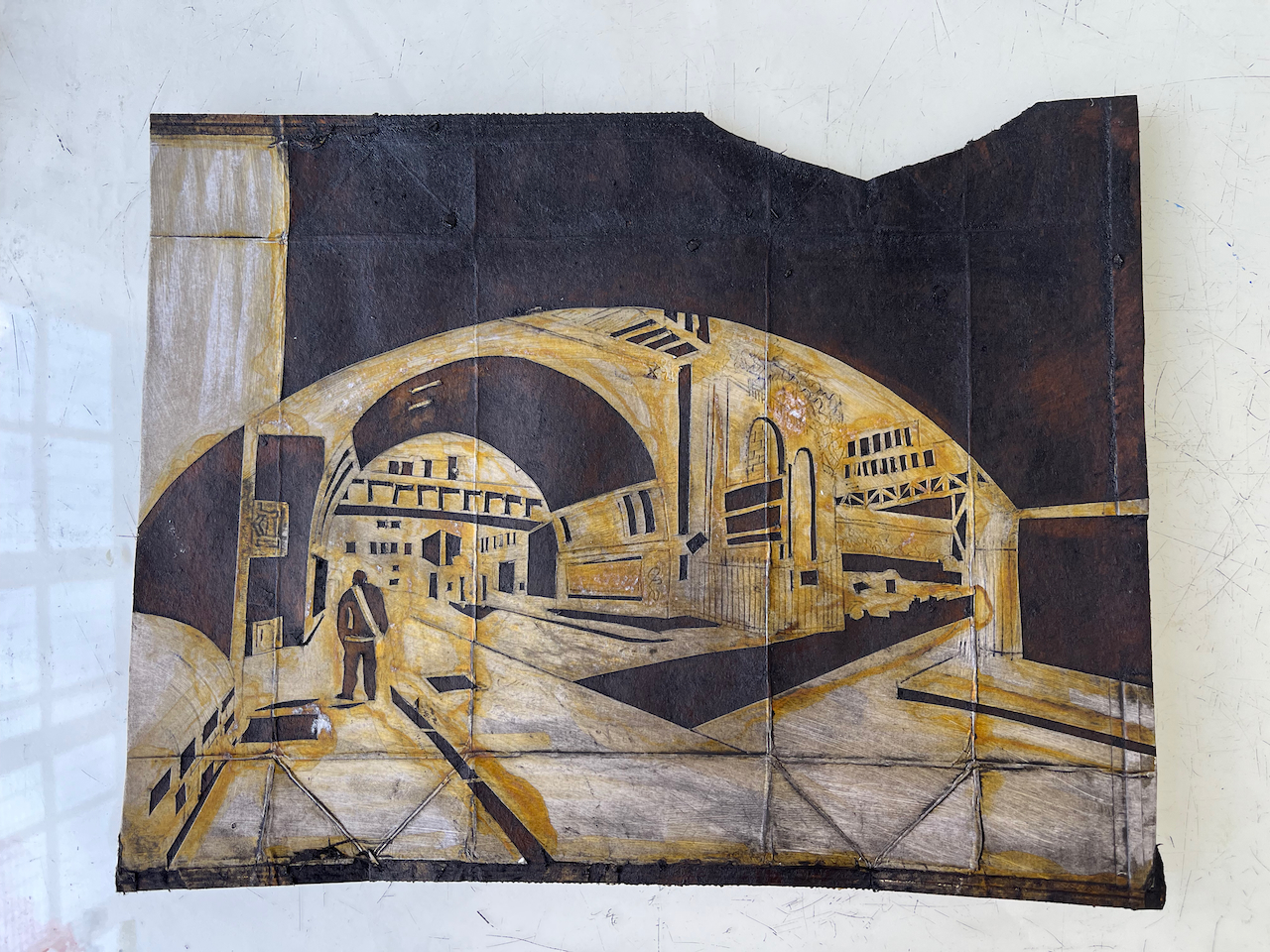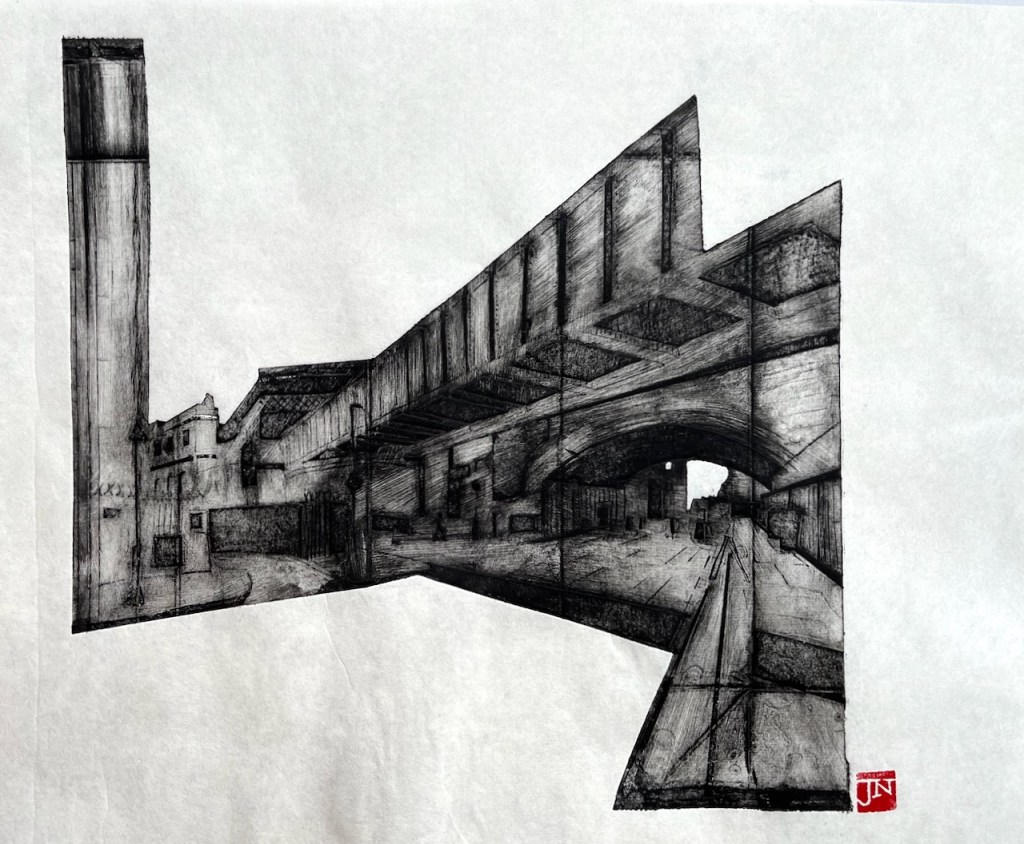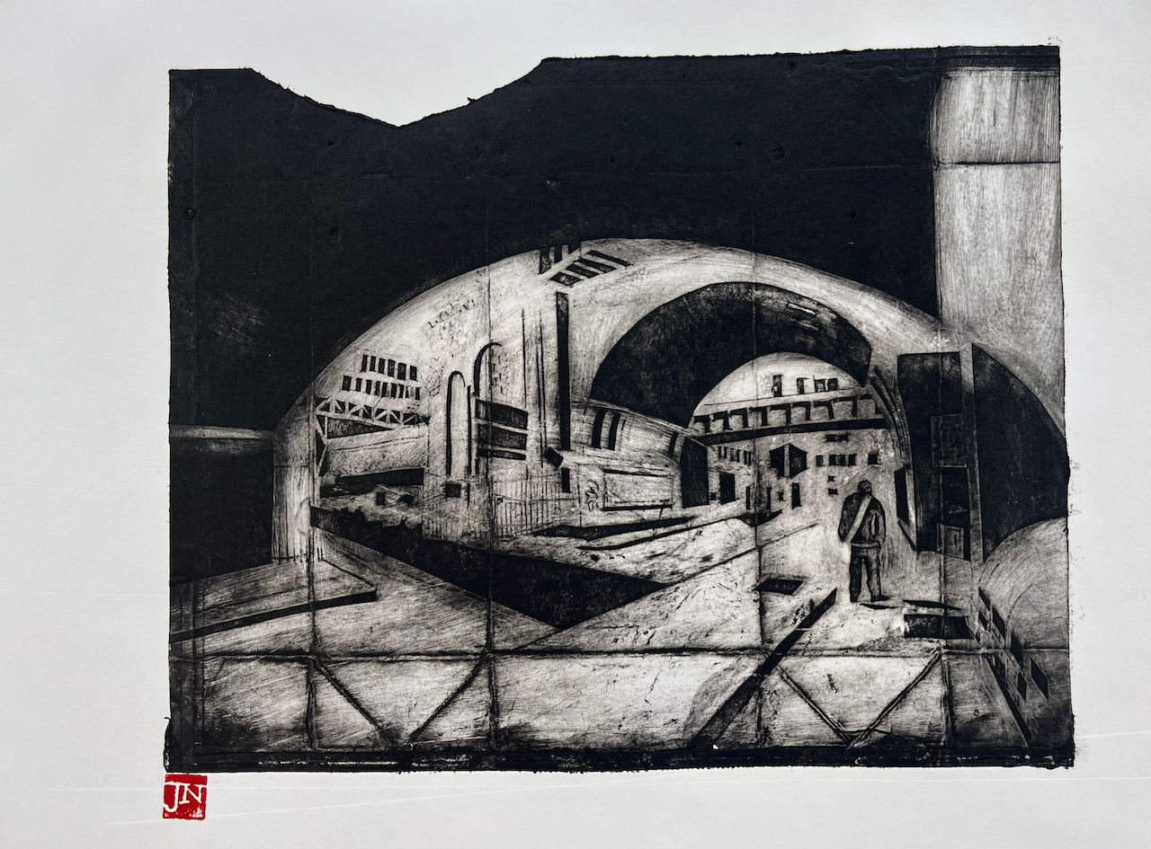 Great Suffolk Street railway arch, monoprint #6 of 6. Printed image size 12″ x 9″. On Agawami Washi Kitakata Japanese paper, 20″ x1 4″
