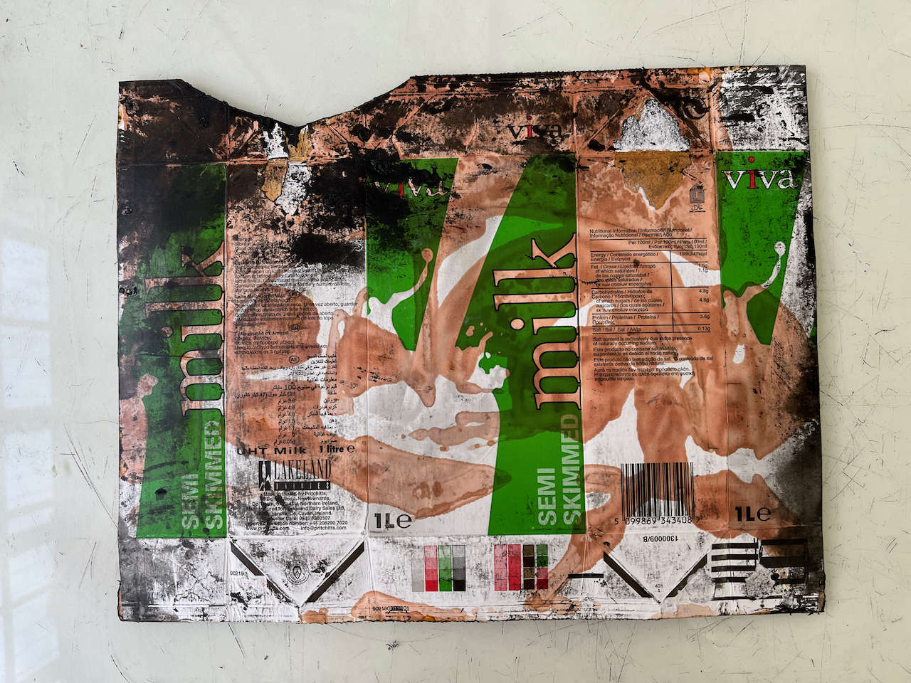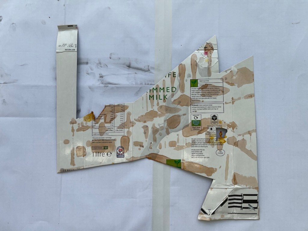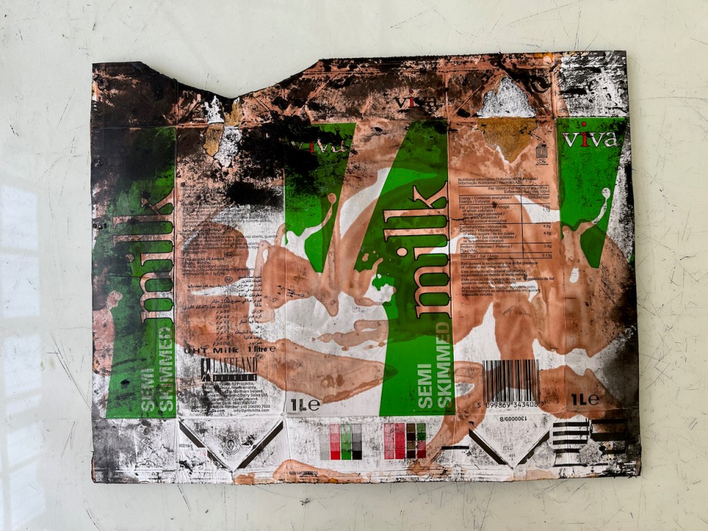 This is a packaging monoprint. It is an intaglio print from a “plate” made from a milk carton. Here is the plate:
