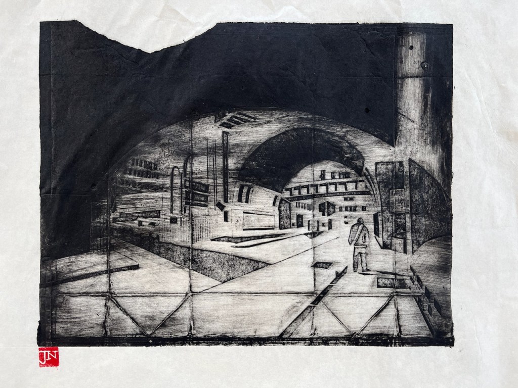 I am trying an experimental monoprint technique. The idea is to use packaging material to make intaglio “plates” which are then printed using an etching press. This is the first one. I printed it yesterday…